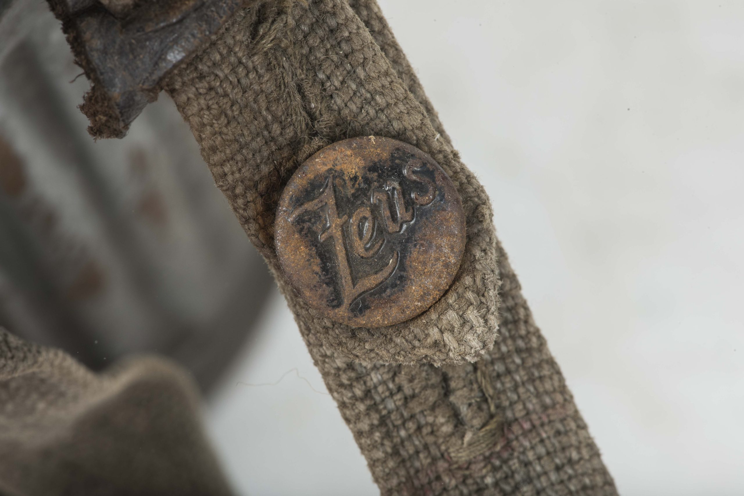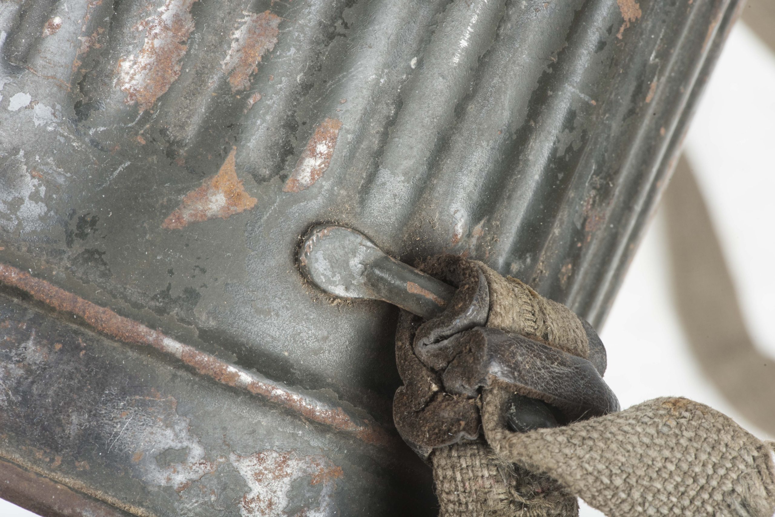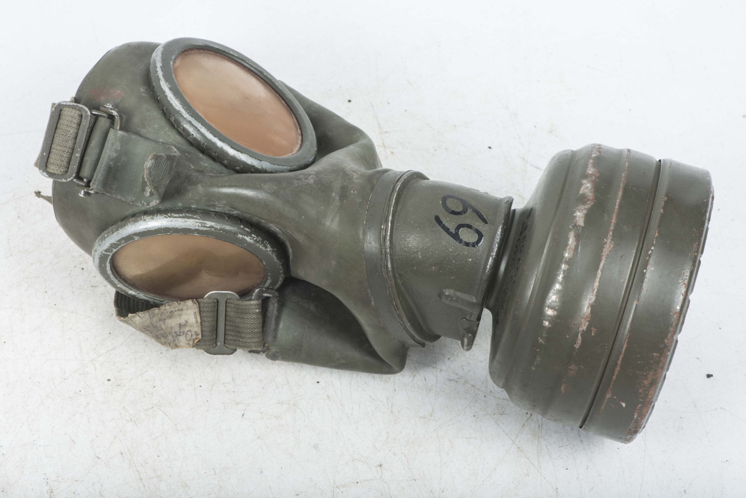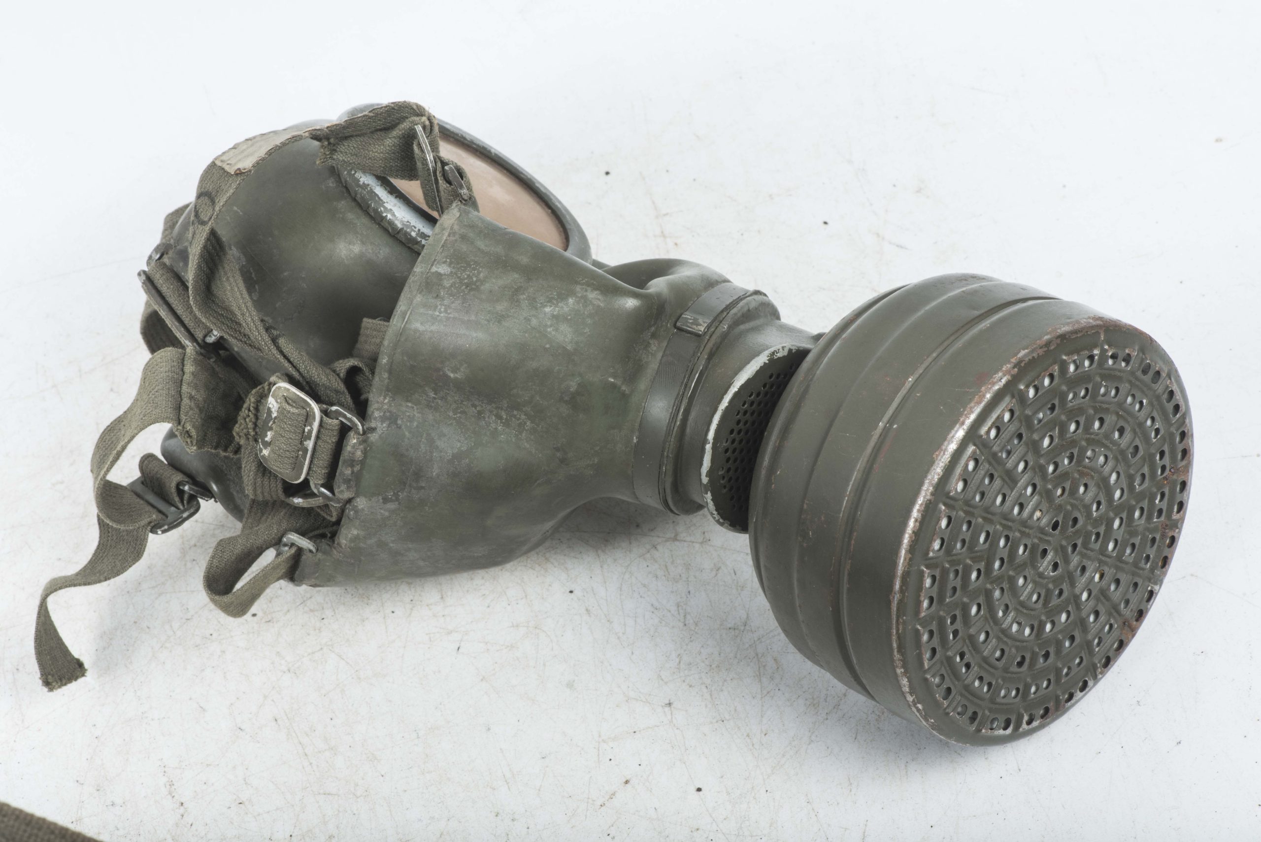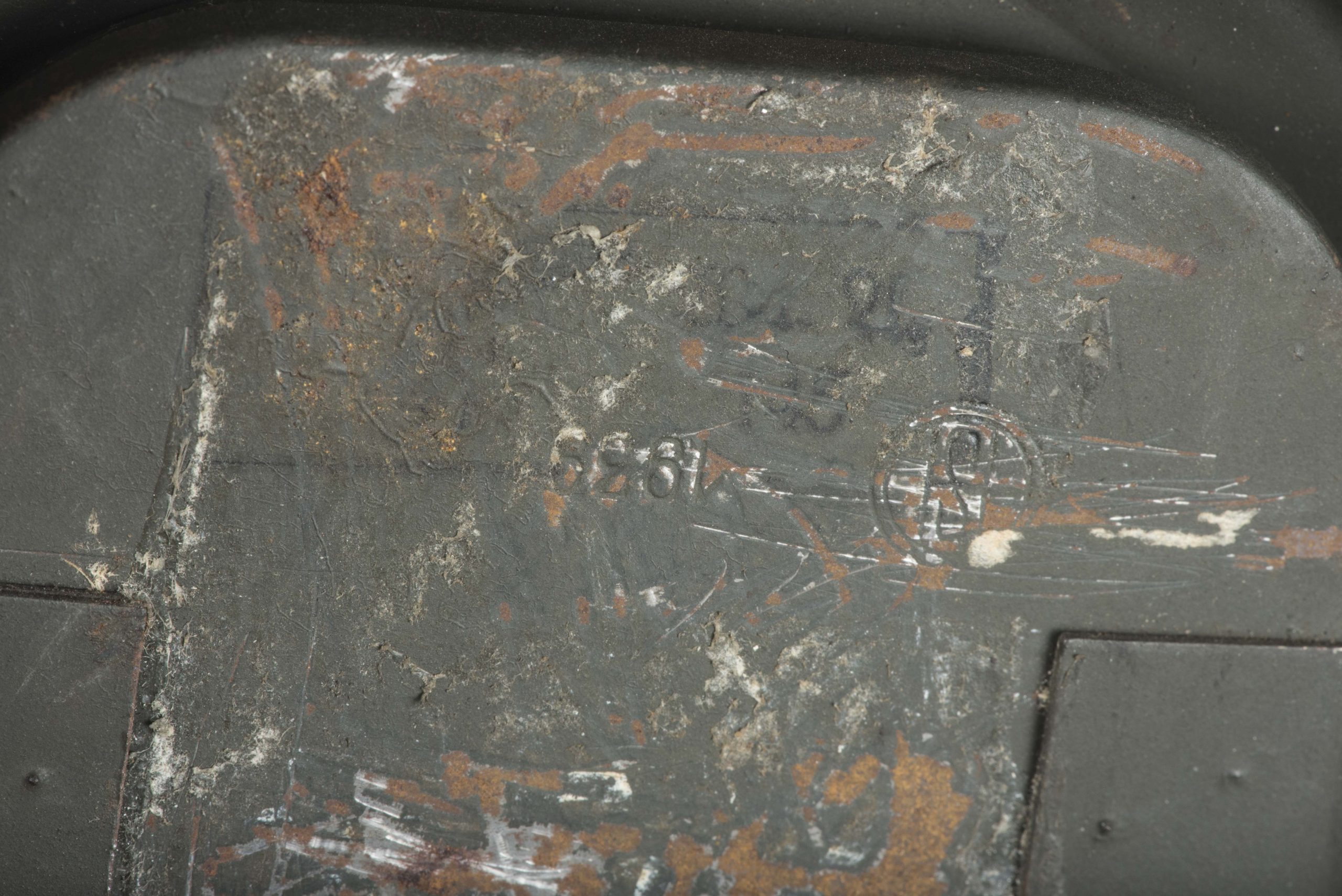 Textbook M38 gasmask in tall canister in very good condition. The canister features a typical rough field repaint. The mask does not have the filter with it. The gasmask itself is a nice green rubber variant. The straps of the gasmask itself feature a label and writing which indicates this set belonged to Obergefreiter Imm, Feldpostnummer 42931. Very nice named set!