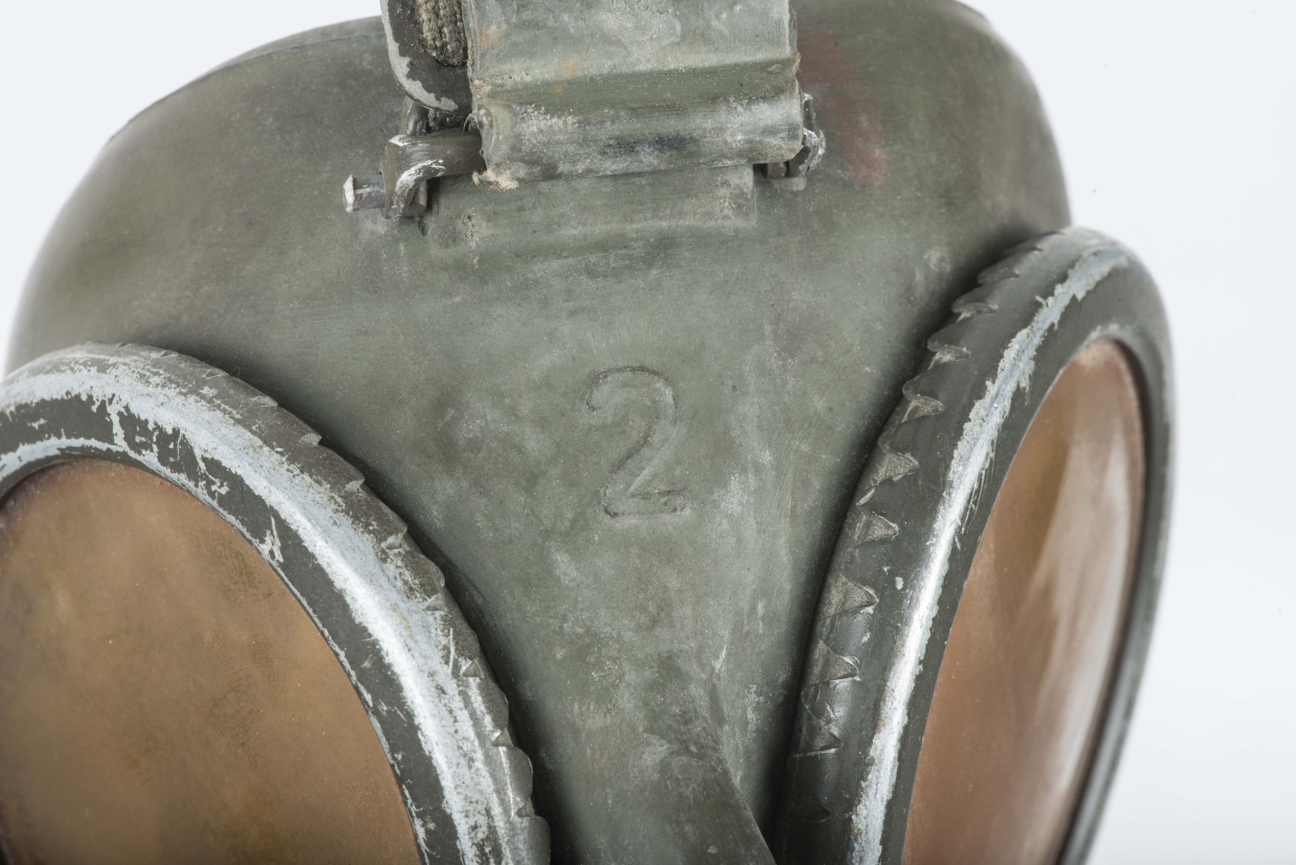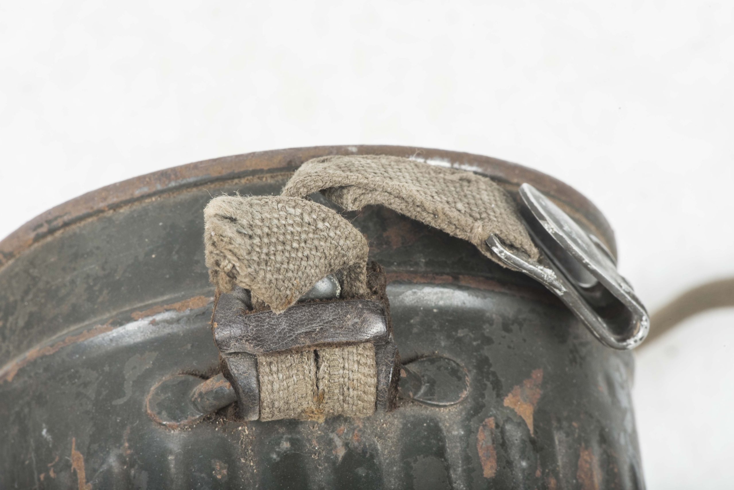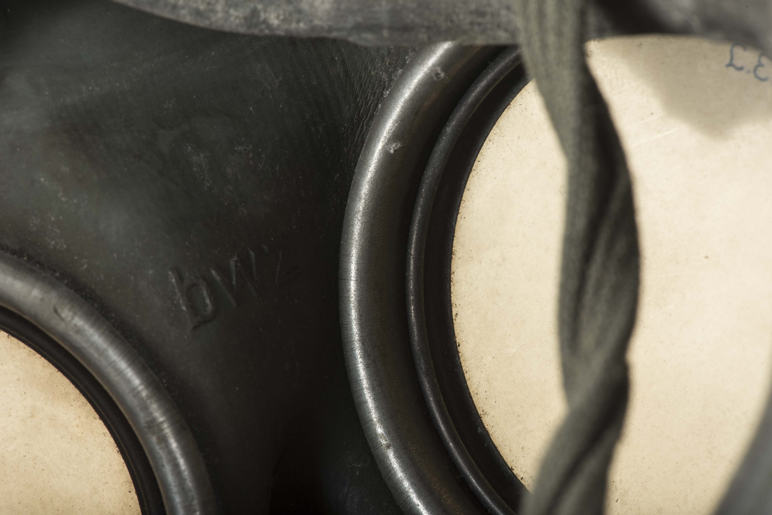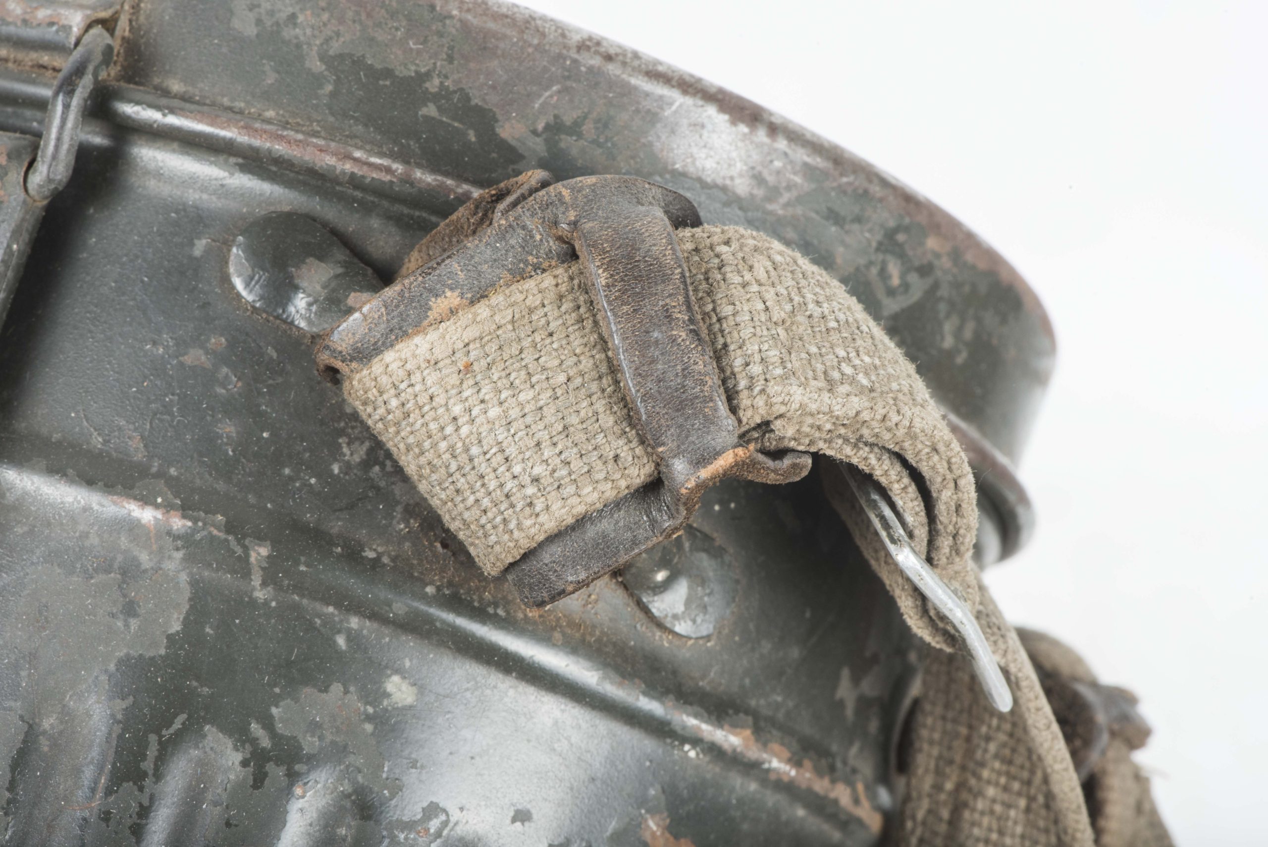 Textbook M38 gasmask in tall canister in very good condition. The canister features a typical rough field repaint. The mask does not have the filter with it. The gasmask itself is a nice green rubber variant. The straps of the gasmask itself feature a label and writing which indicates this set belonged to Obergefreiter Imm, Feldpostnummer 42931. Very nice named set!