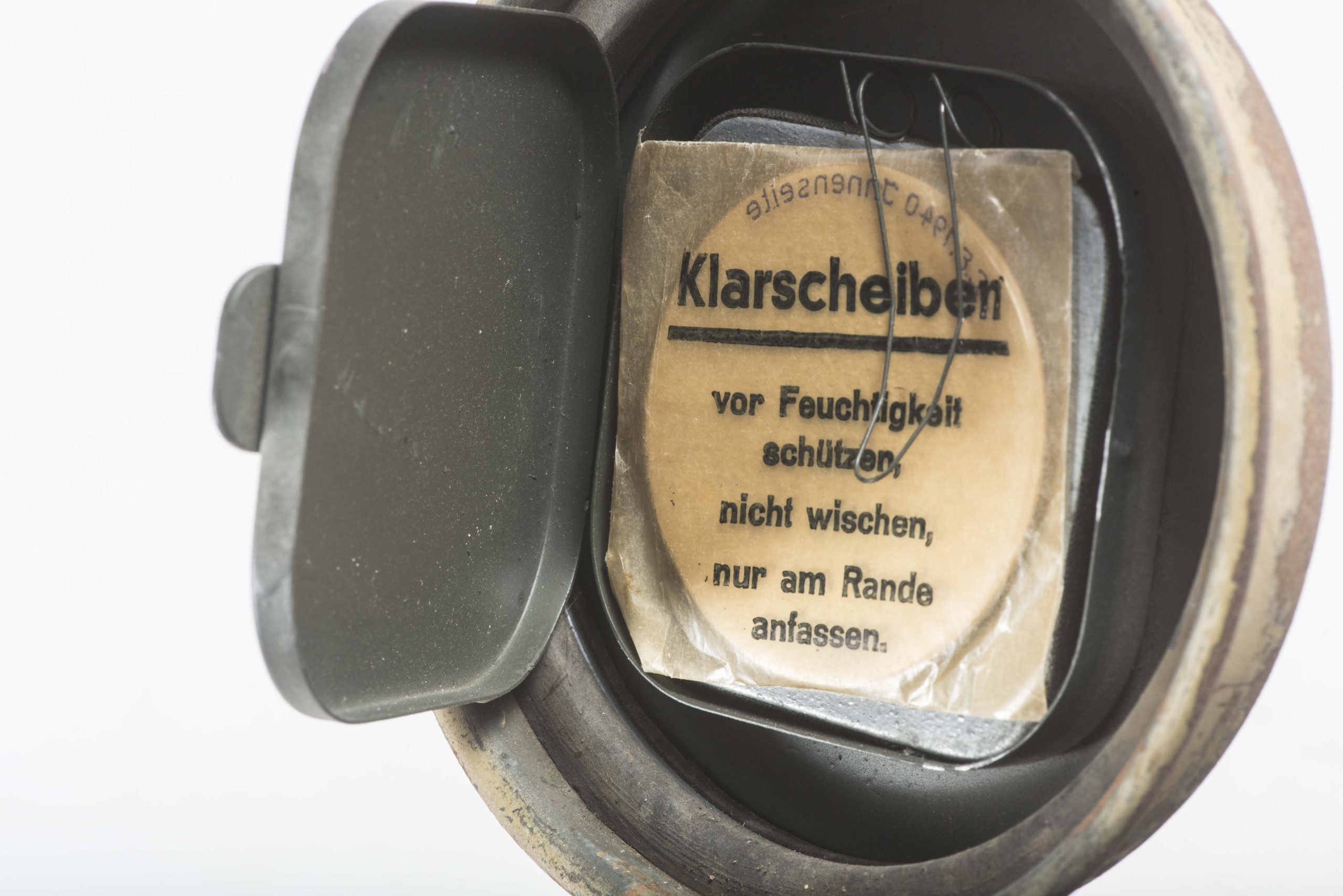 Tall M38 gasmask canister set in tan camouflage with rare airtight rubber seal. The canister is nicely named Uffz. and later Feldwebel Petersen. The canister retains up to 80% of its period applied tan paint intended for tropical use. The canister is a rare variant with a rubber seal inside the lid making it airtight which was important in tropical circumstances. The spare lenses are additionally of the tropical kind which is hard to find as is and the first time I see them in a canister. The gascape pouch is attatched to the leather tipped straps and is also a tan variant. This is by far the most convincing and untouched ‘tropical’ camouflage gasmask canister set in good used condition.