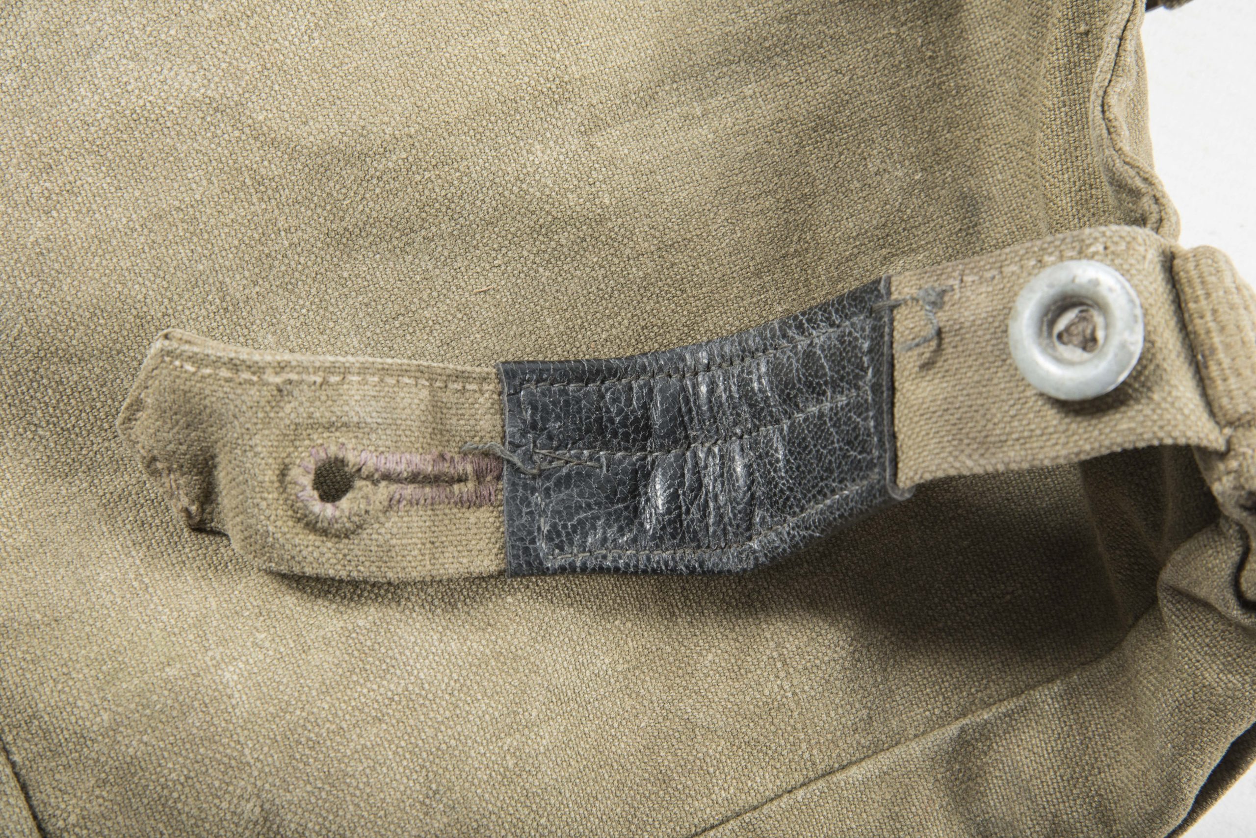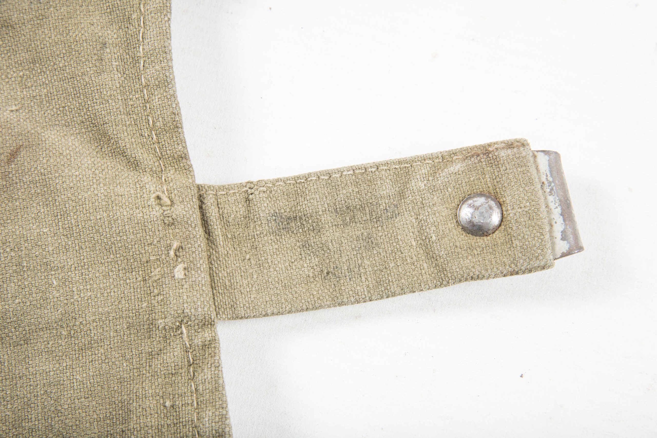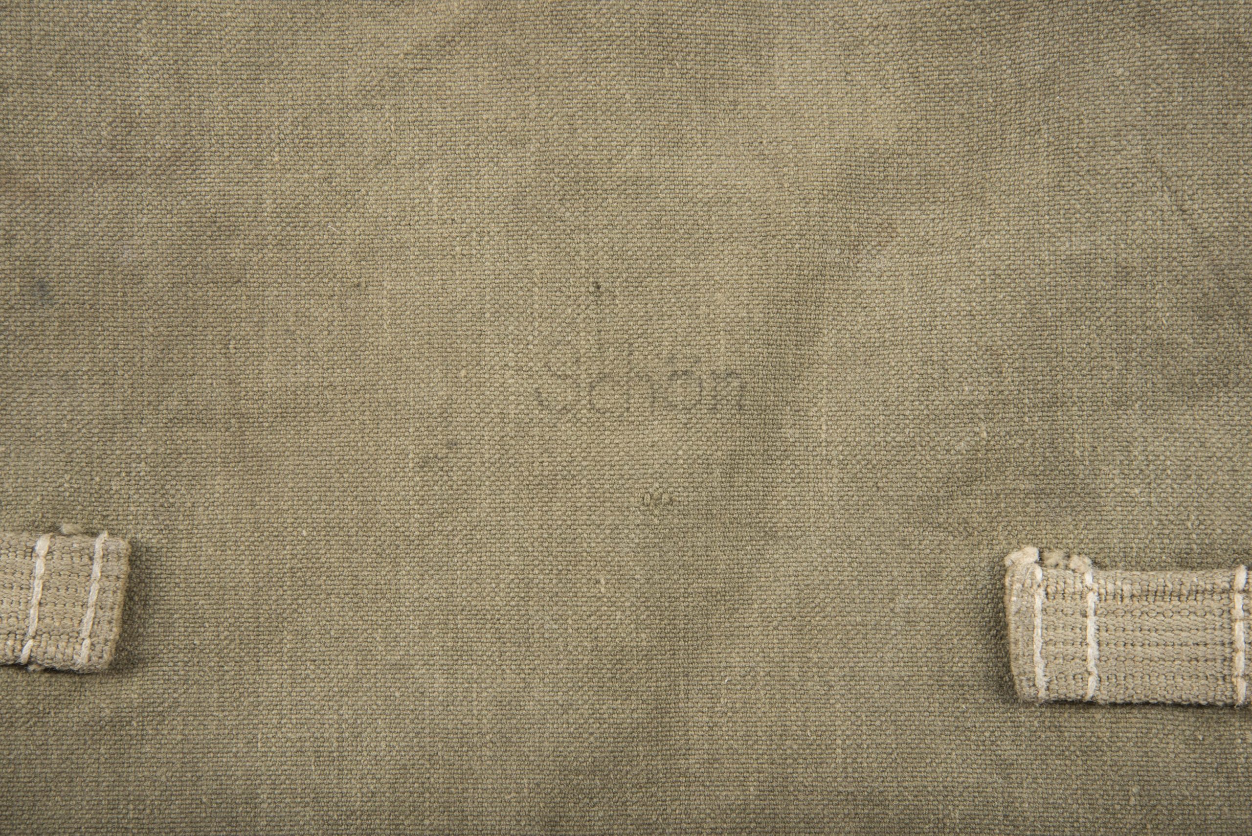 Tropical M31 breadbag with captured Dutch leather parts named Schön. The leather reinforcements on the belt loops as the central closing stap are made of typical Dutch leather. Nice collectible variant!