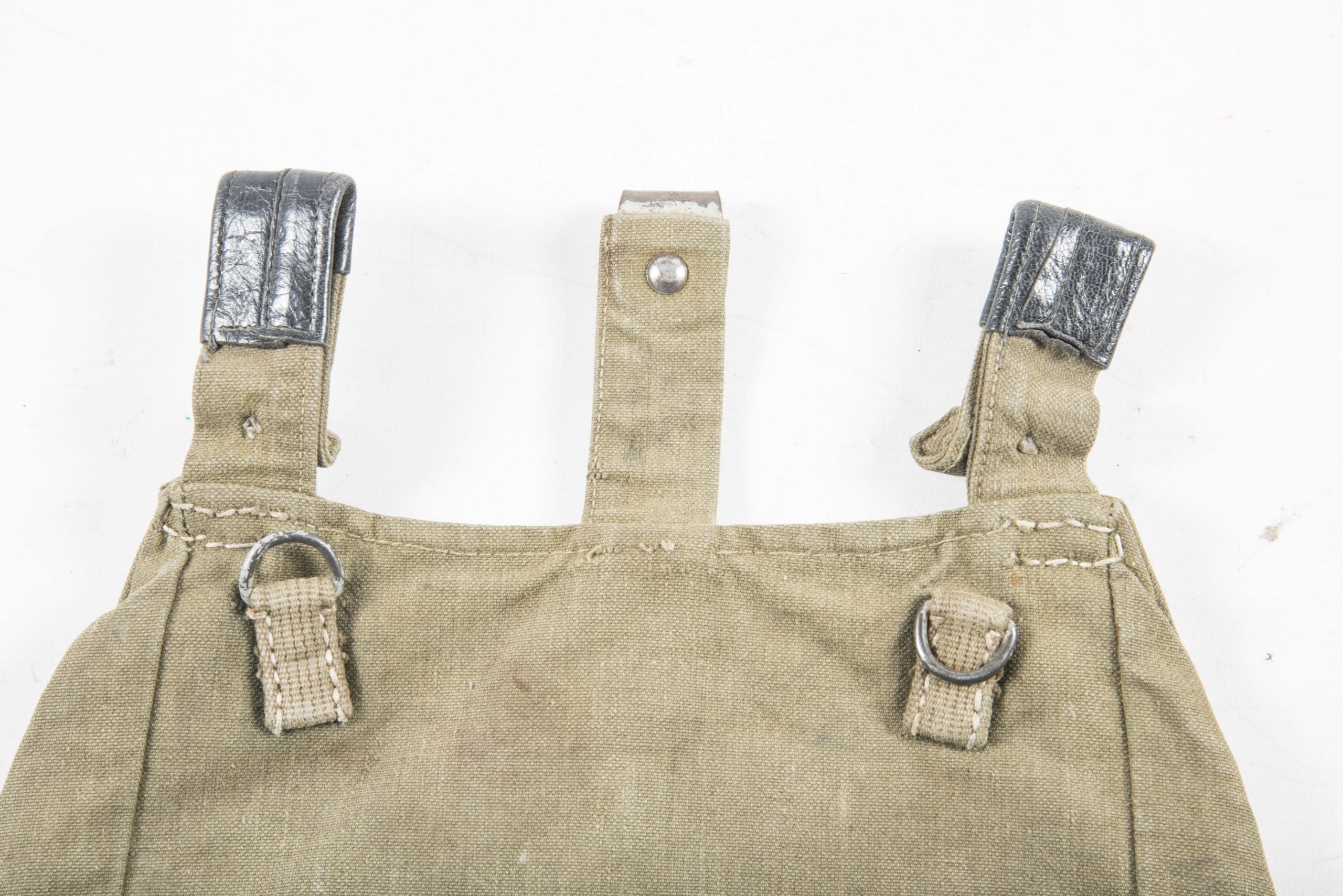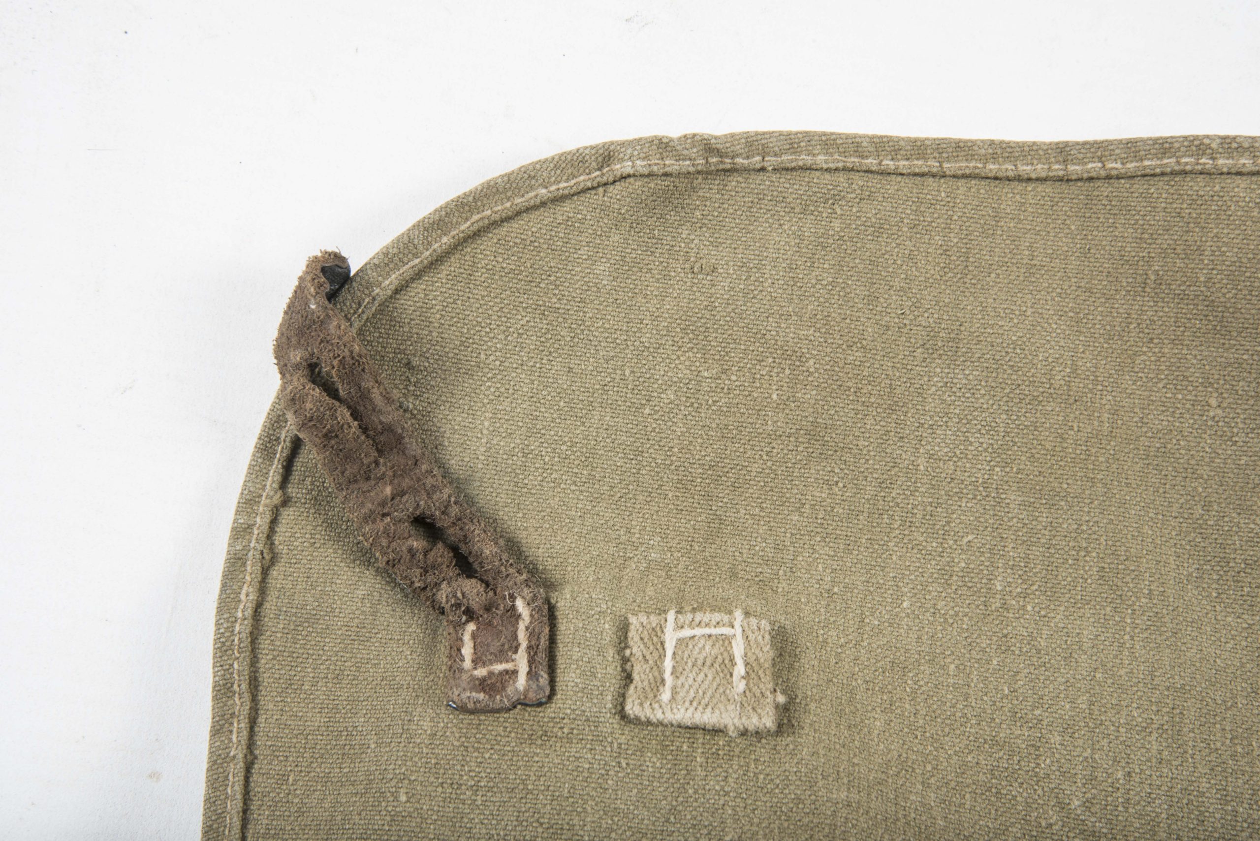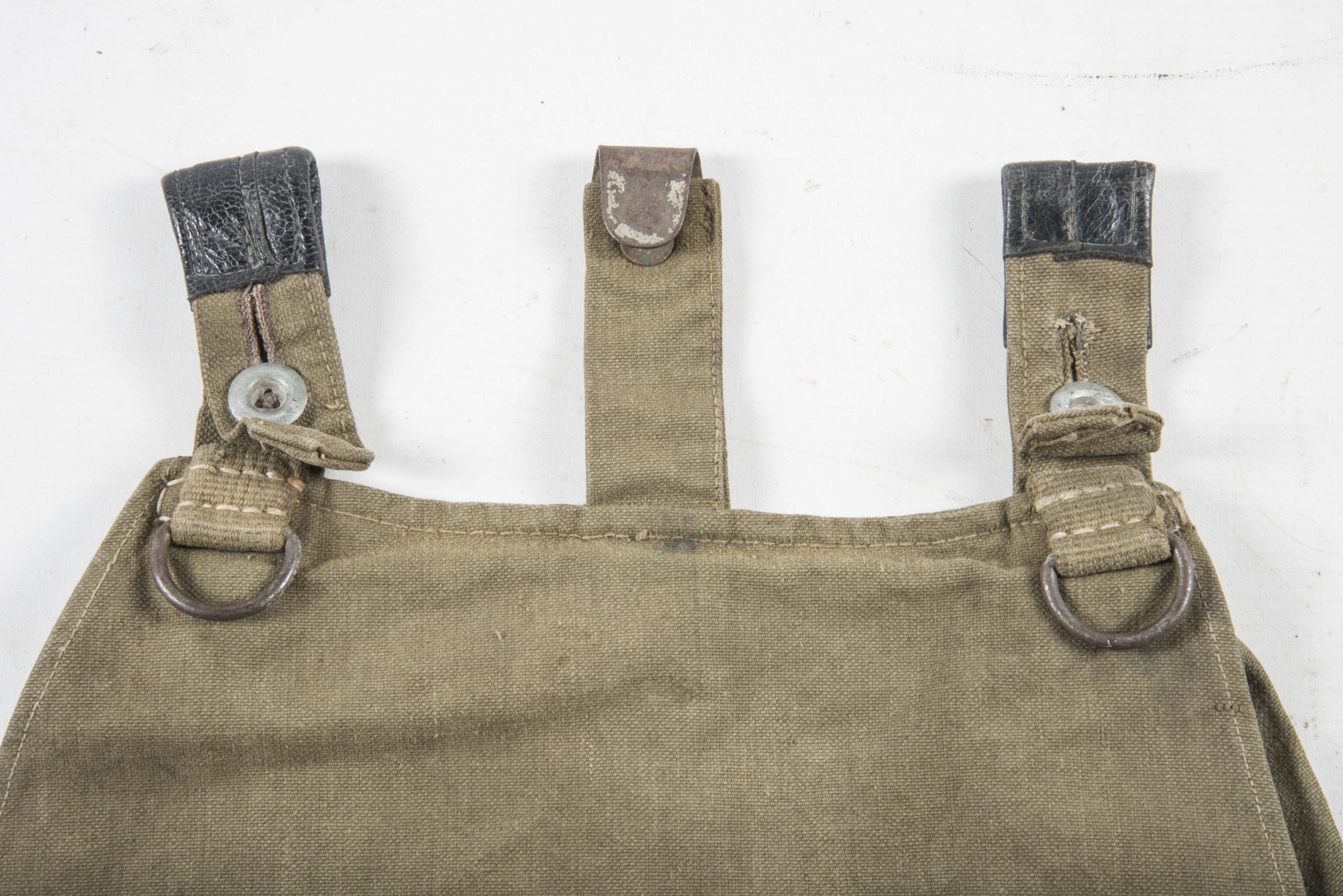 Tropical M31 breadbag with captured Dutch leather parts named Schön. The leather reinforcements on the belt loops as the central closing stap are made of typical Dutch leather. Nice collectible variant!