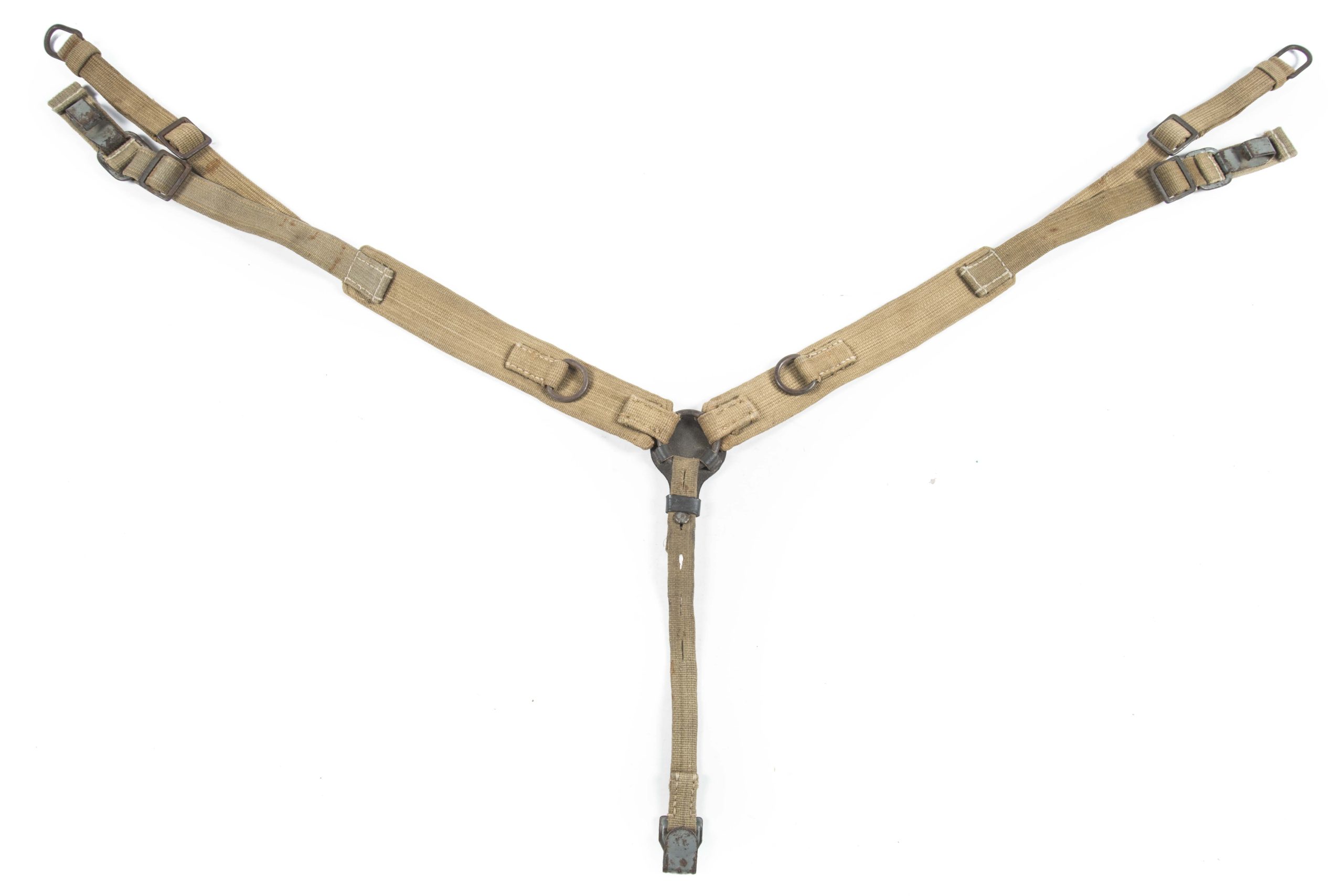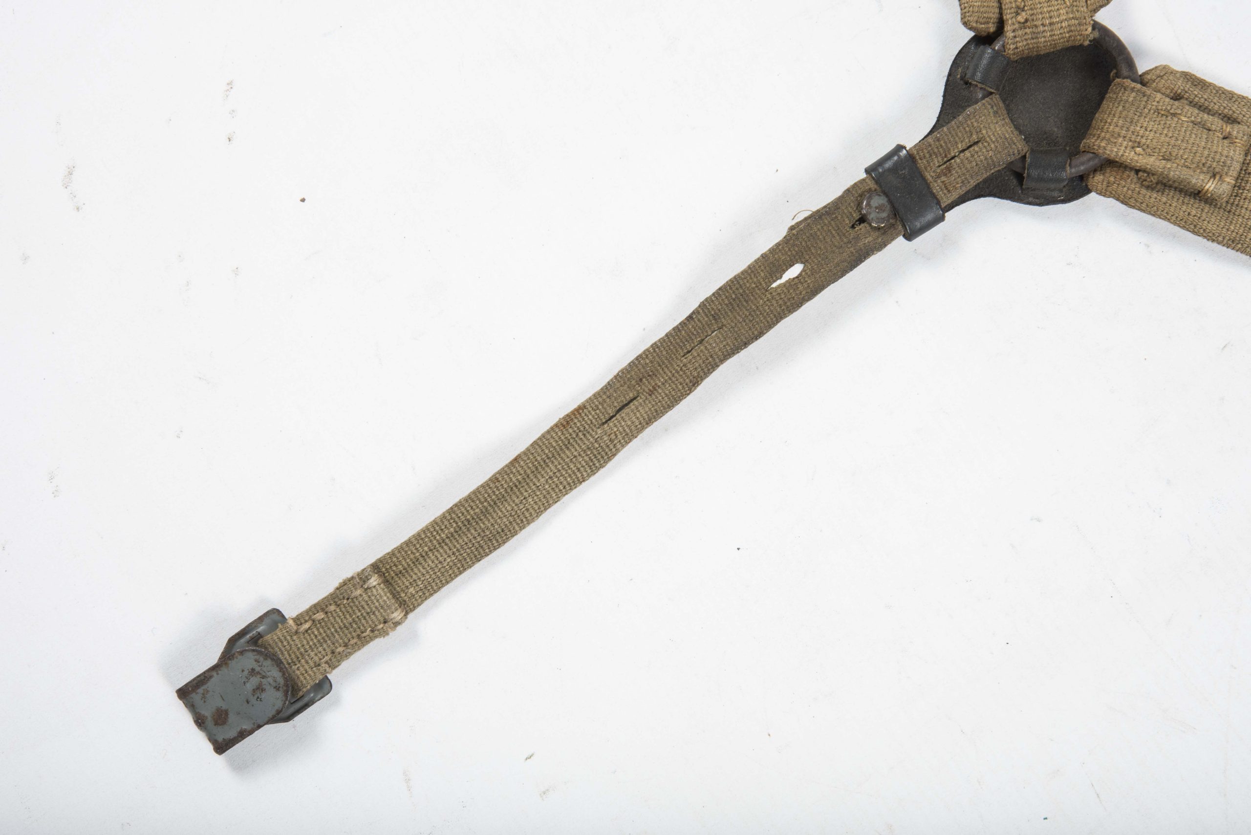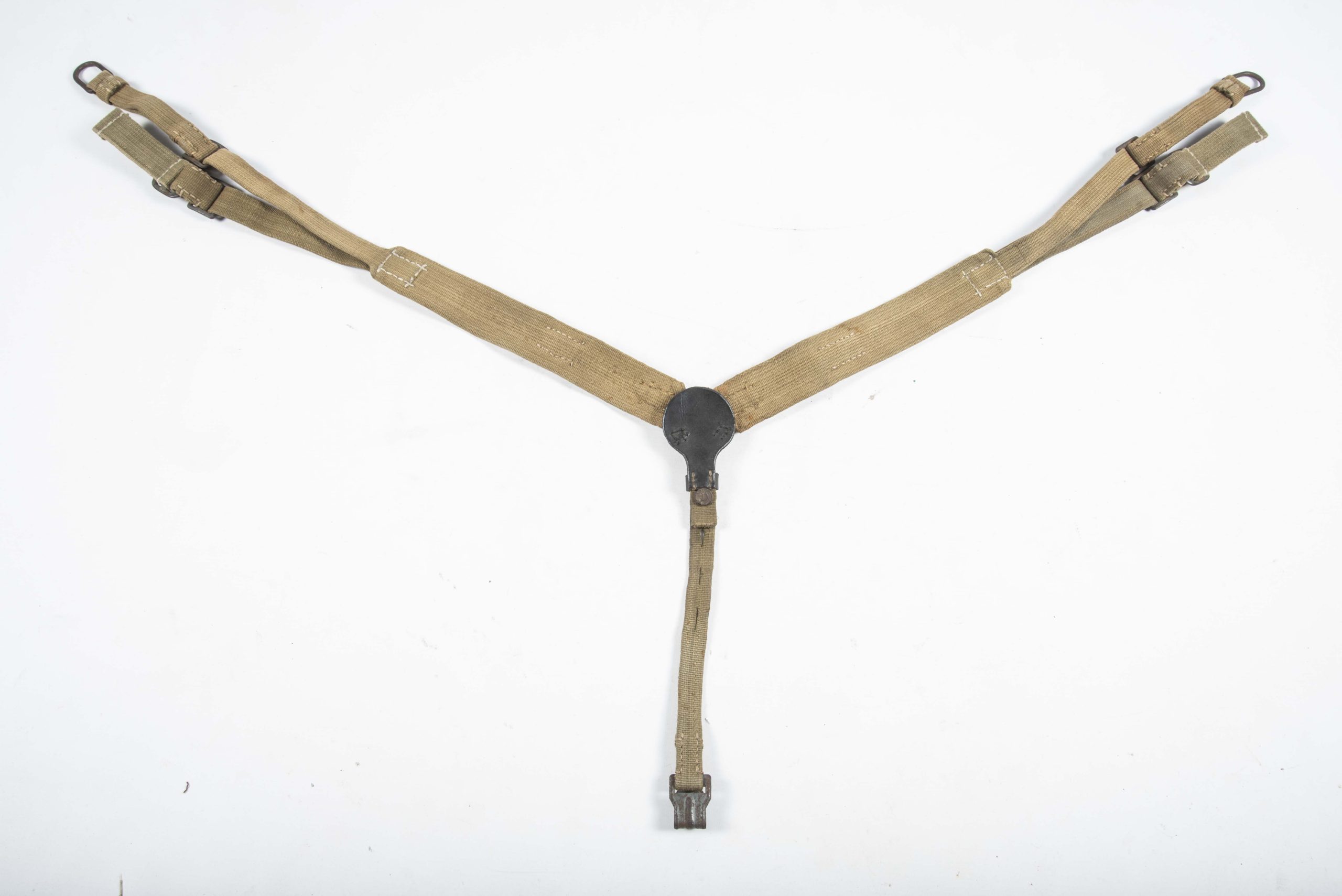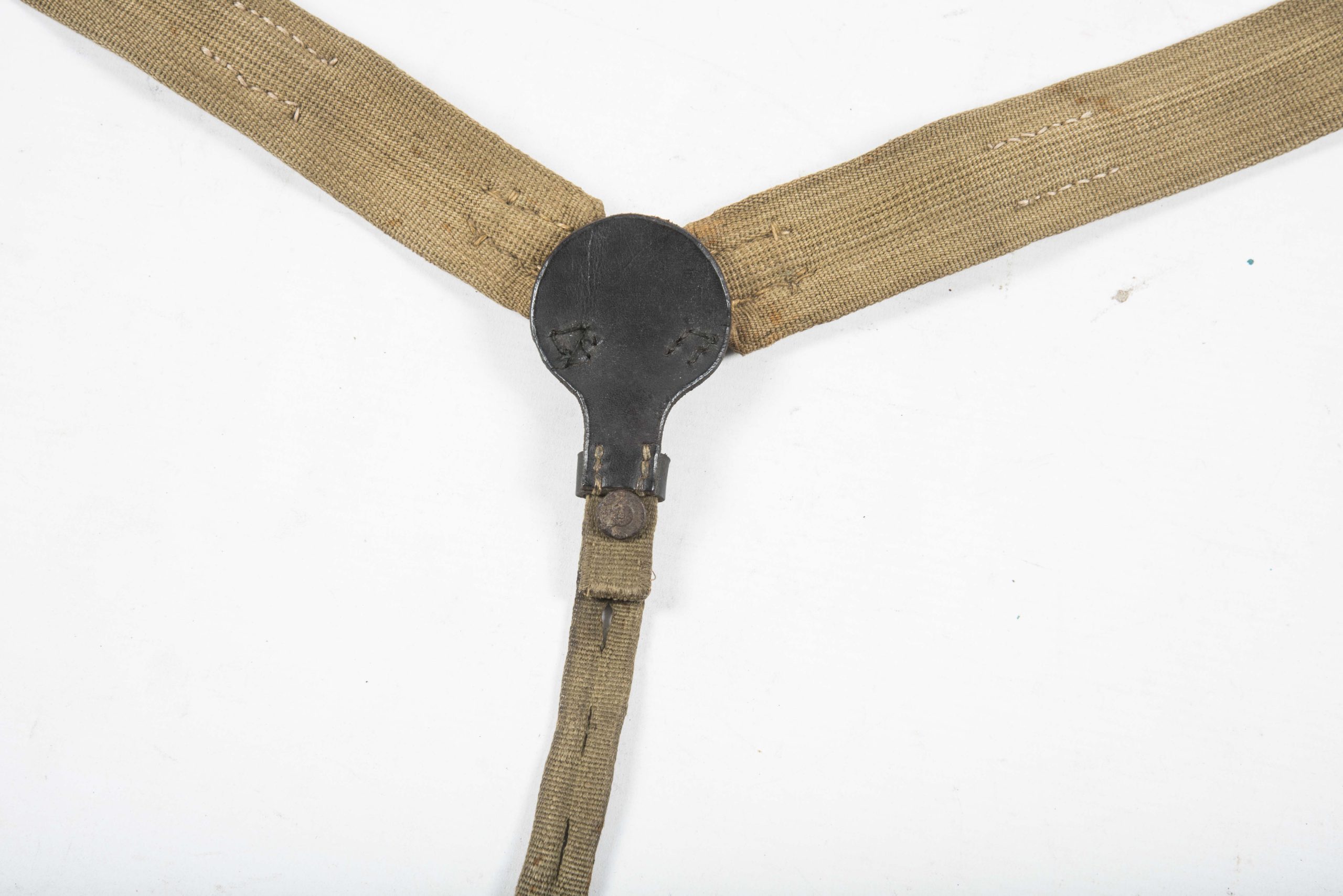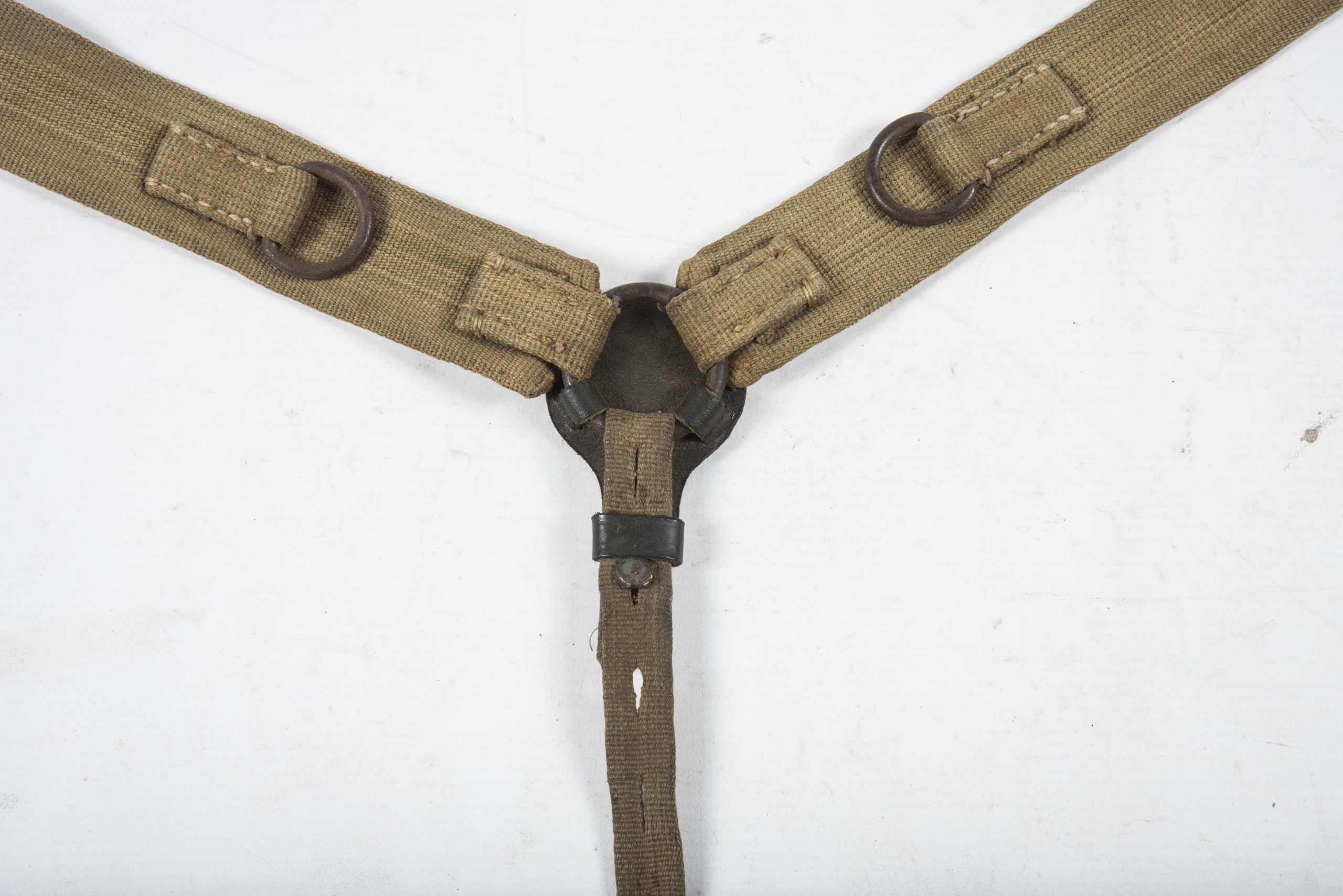 Tropical Y-strap in excellent condition. Textbook example with all the typical details; woven holes in the back strap and a light olive hue in the webbing. Nice example in good used condition!