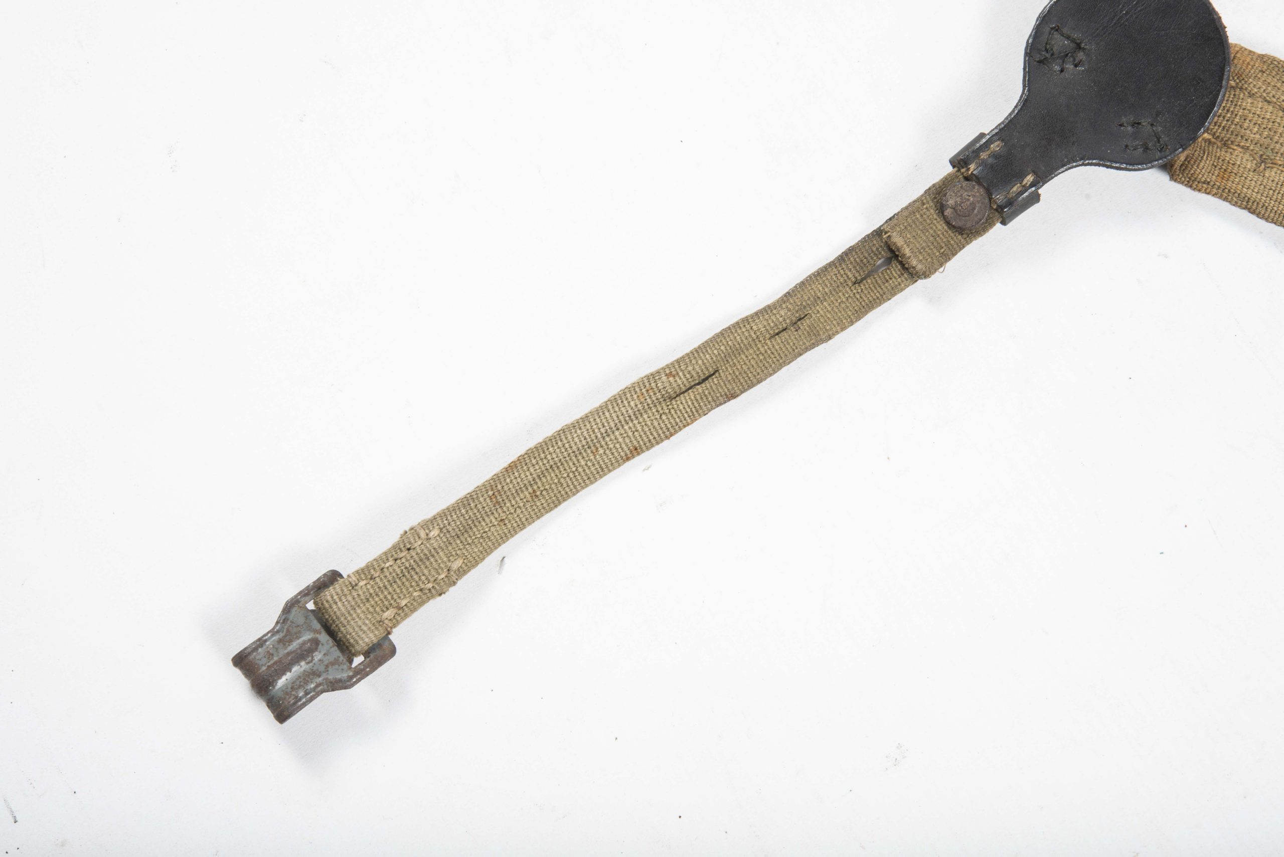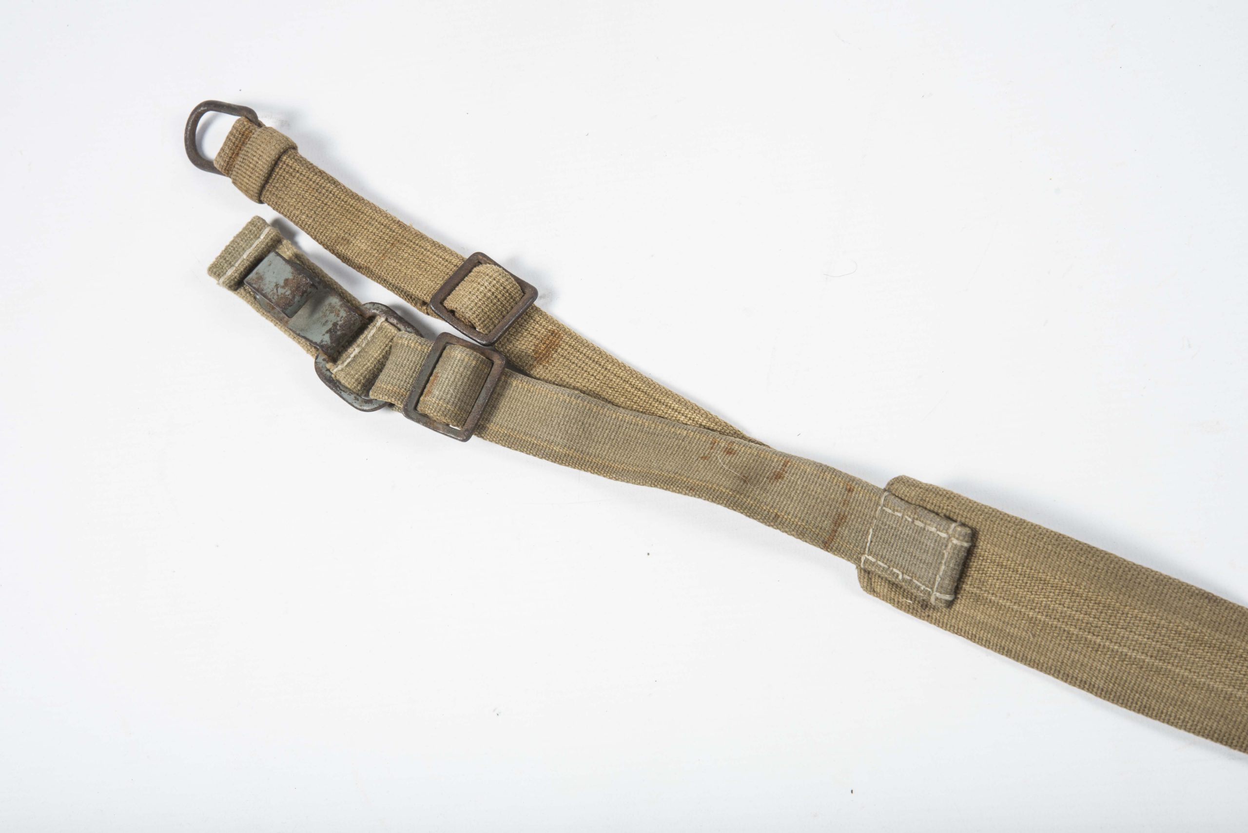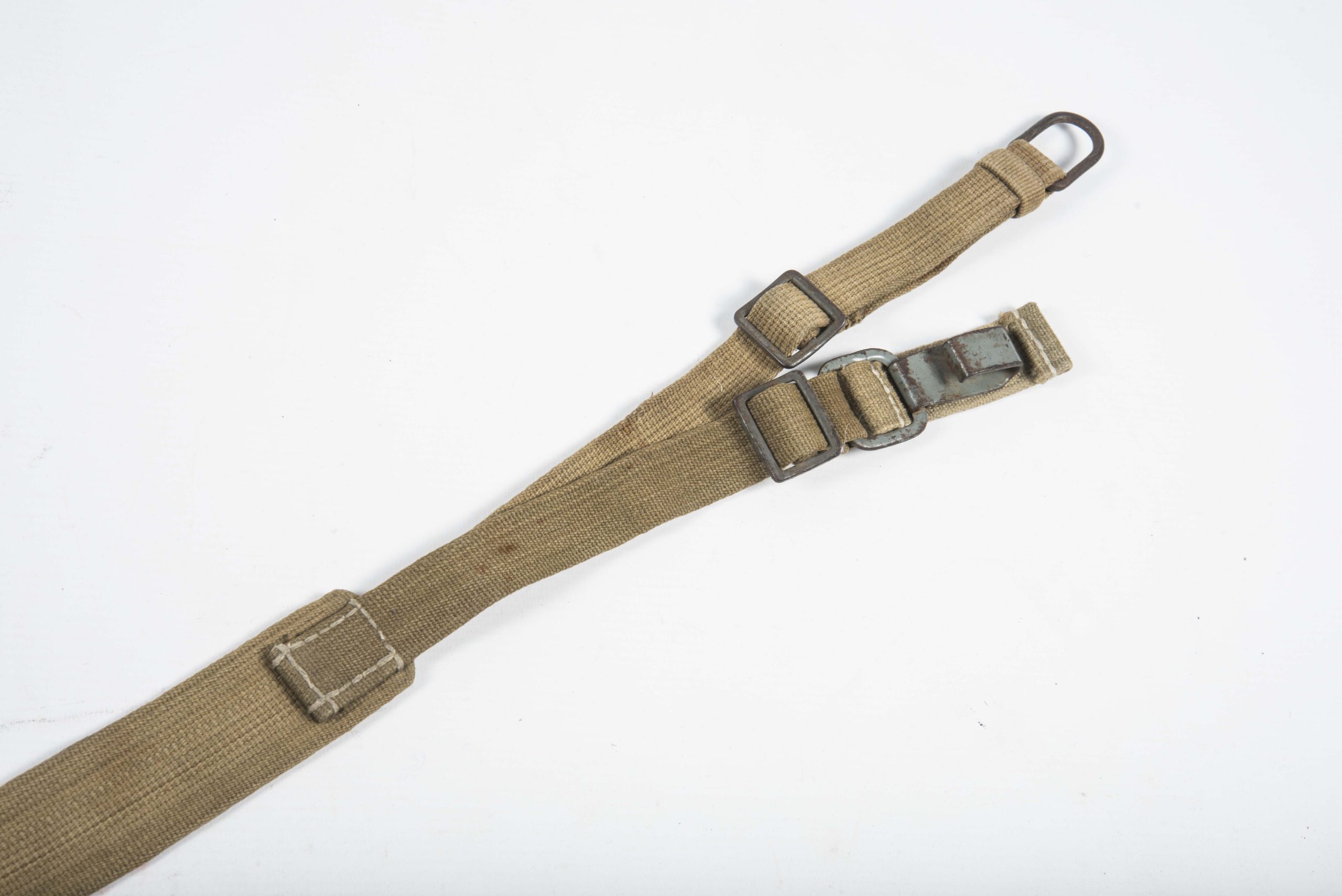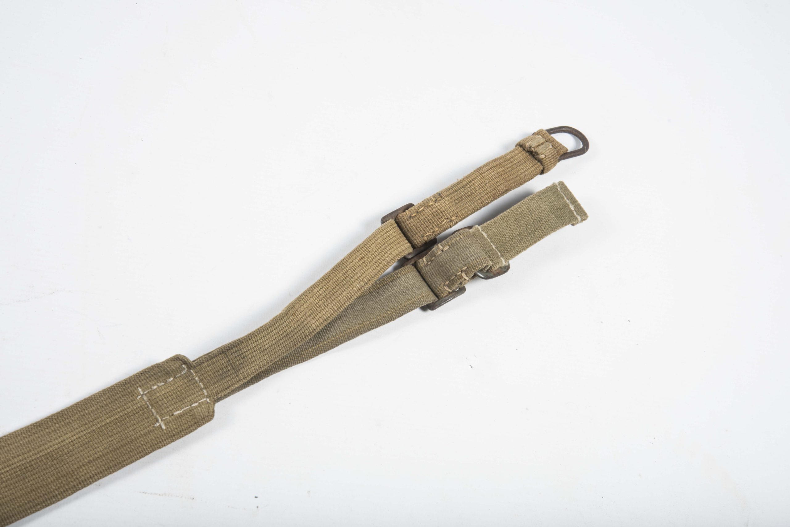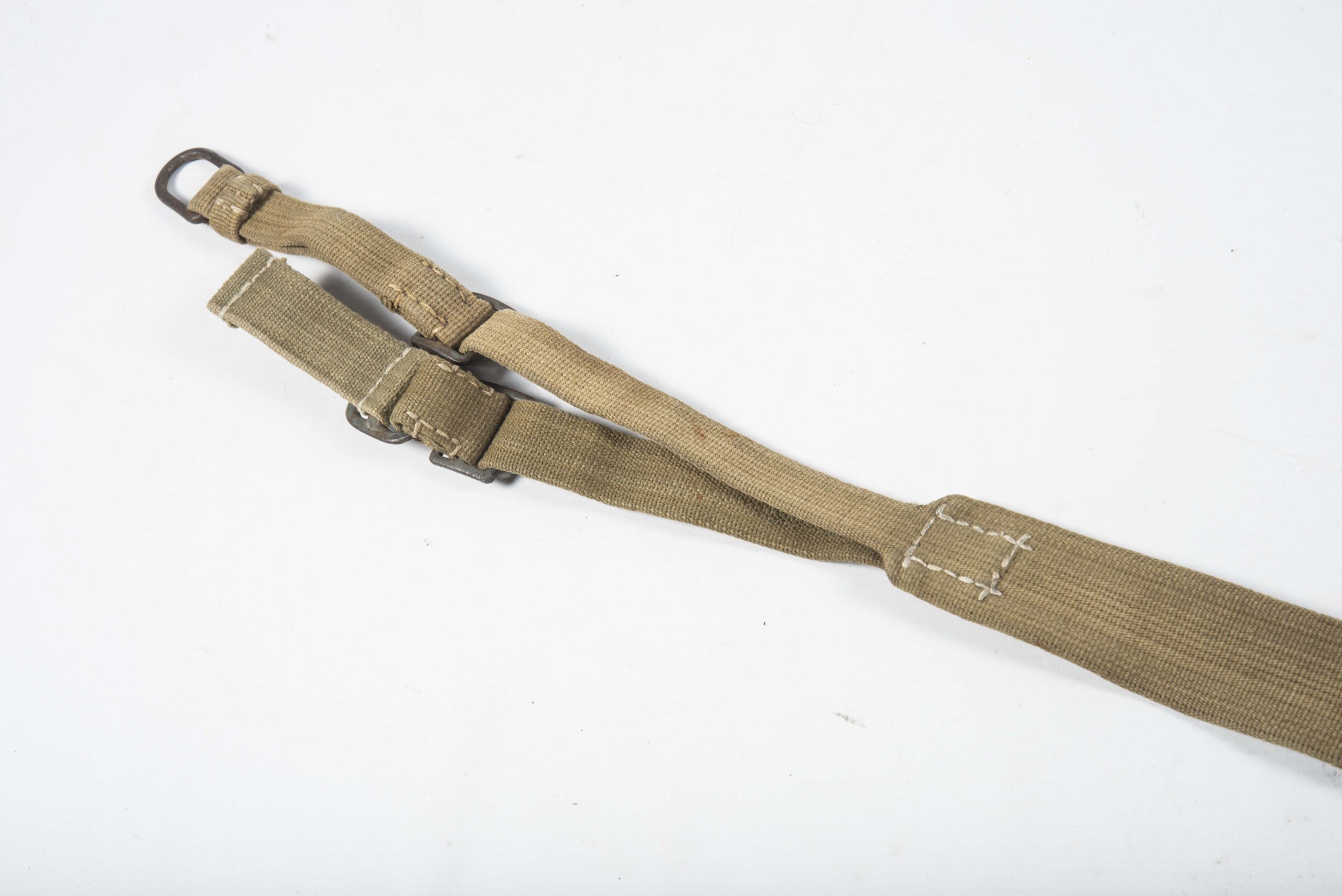Tropical Y-strap in excellent condition. Textbook example with all the typical details; woven holes in the back strap and a light olive hue in the webbing. Nice example in good used condition!