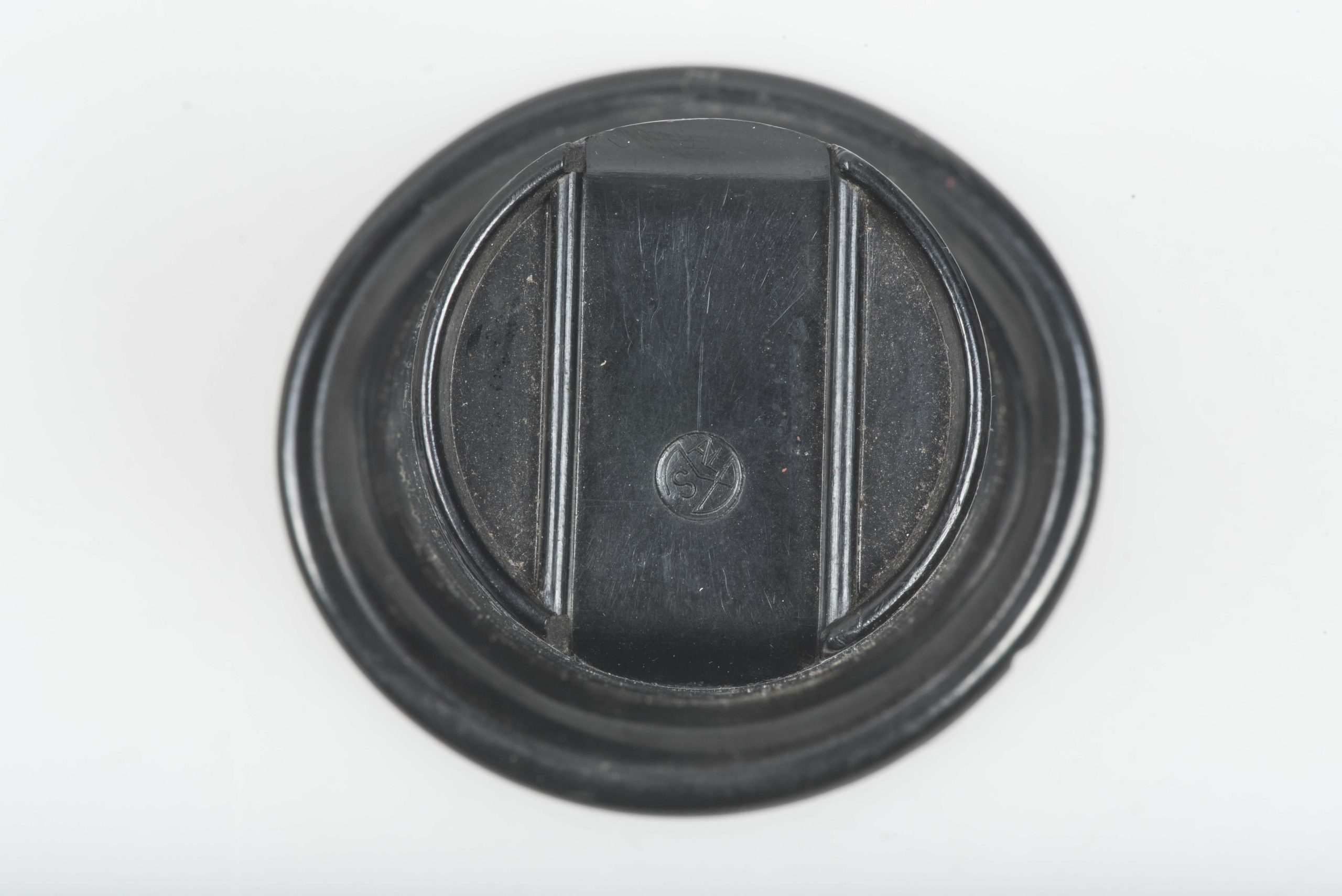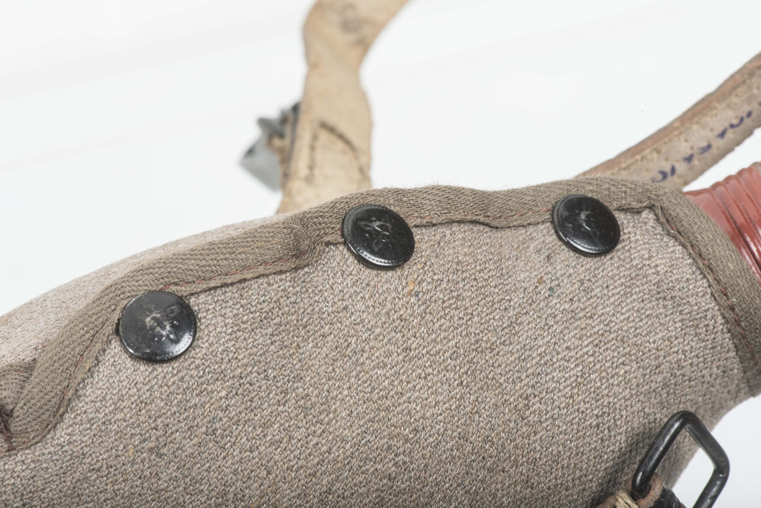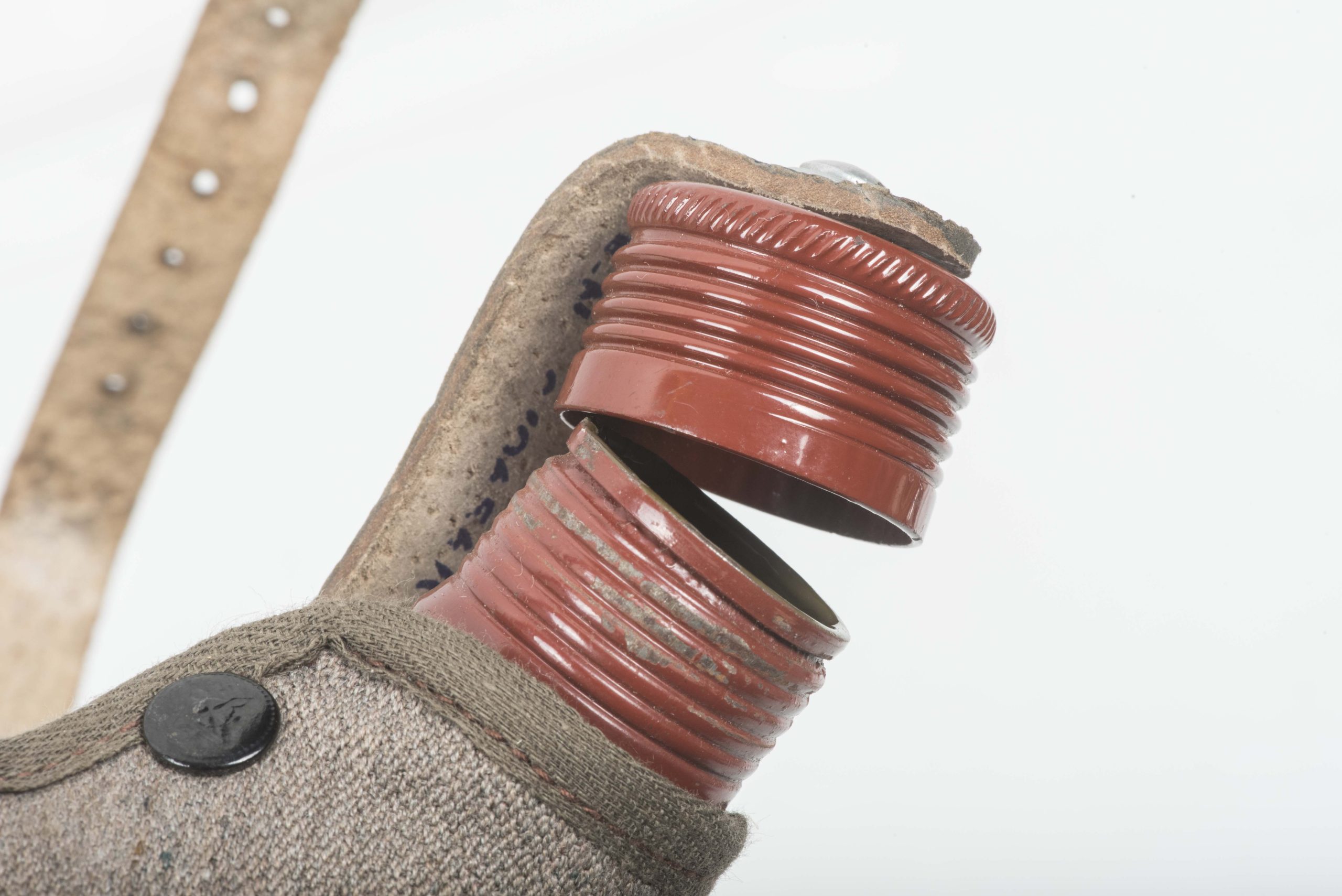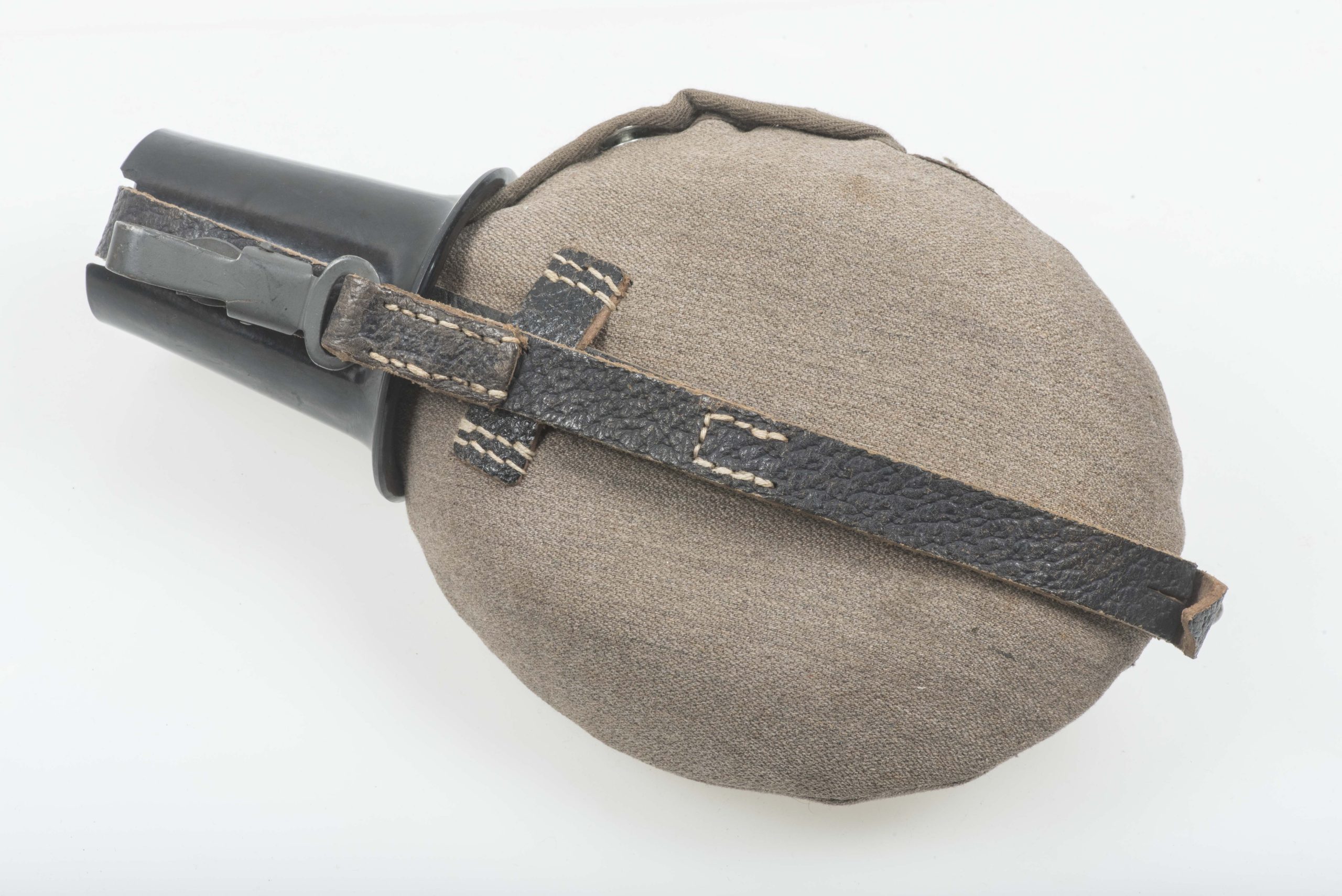 Stone mint and unissued M42 canteen in textbook configuration. The flask itself is nicely marked MN 44 which indicates production by Metallindustrie GmbH. Neunkirchen-Saar (MENESA) in 1944 and comes in configuration with a black bakelite cup marked AL/S. The strap is a textbook late war two piece construction example made out of smooth leather. Perfect example!
