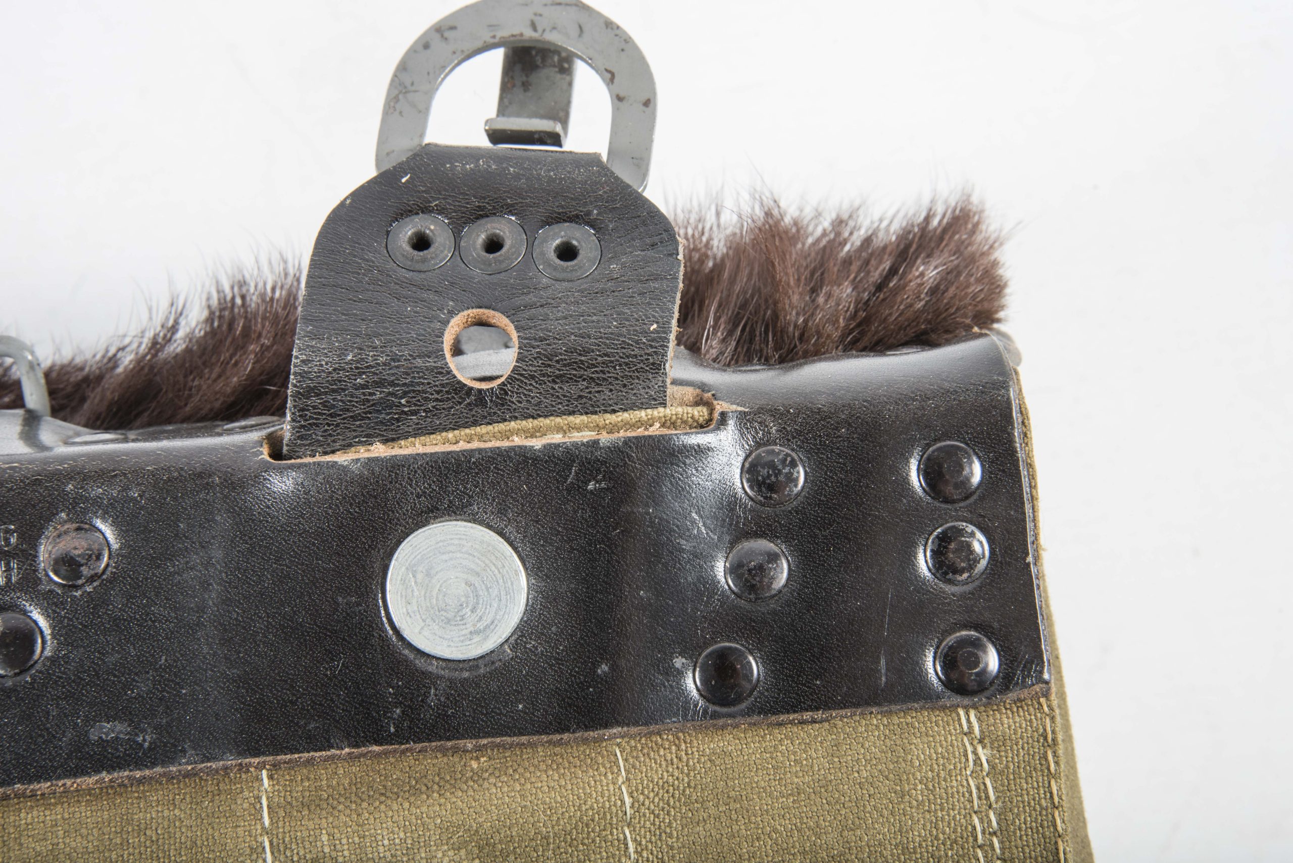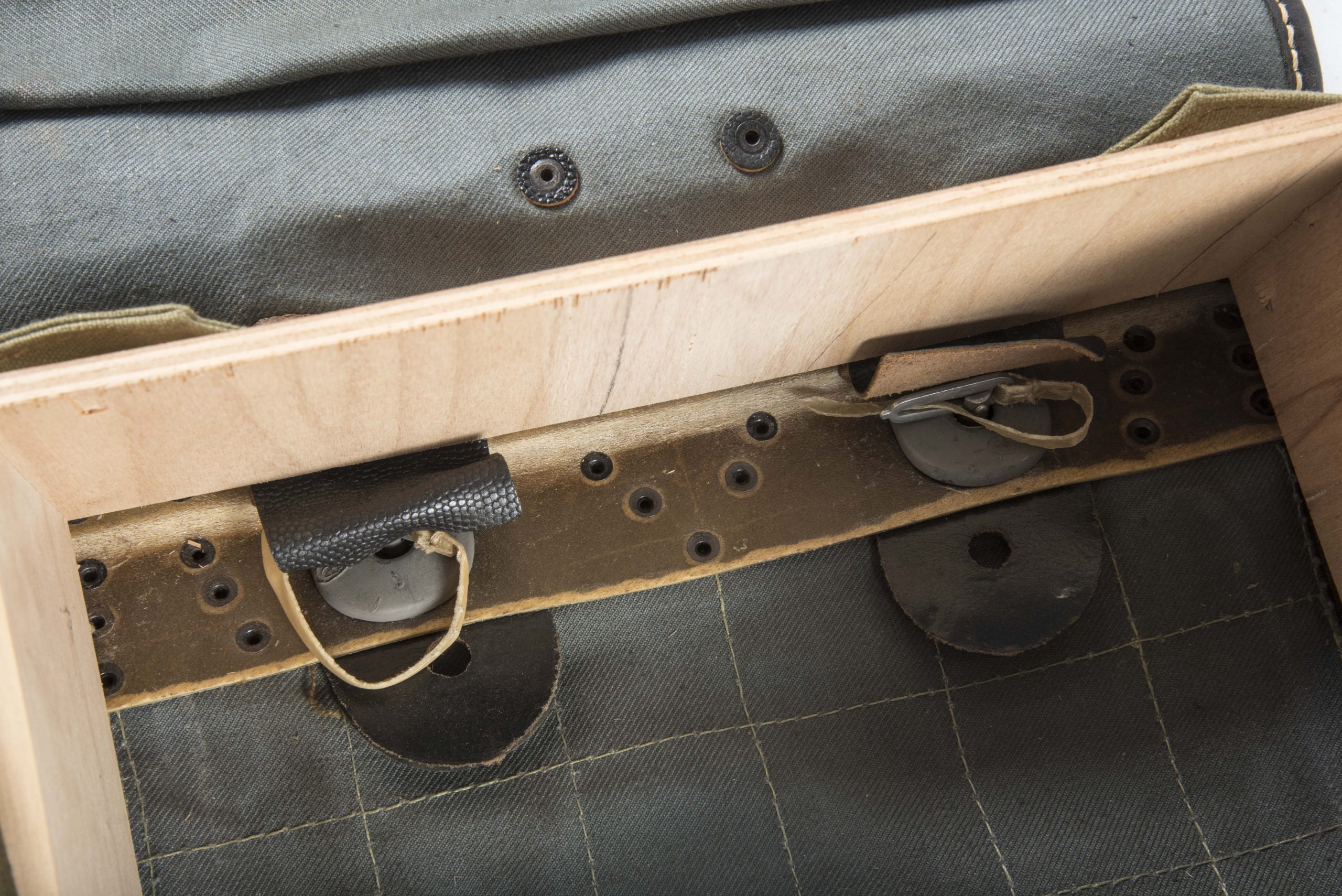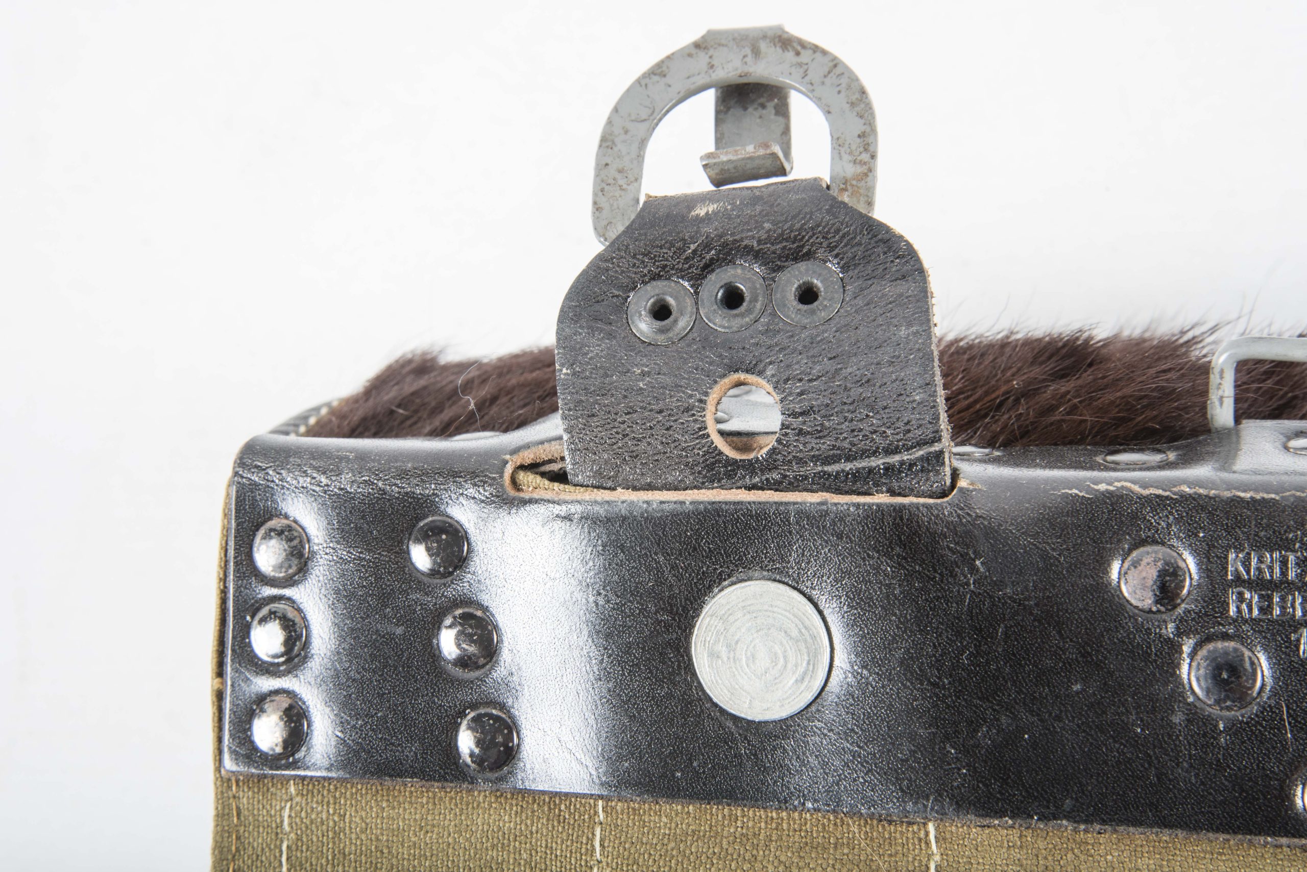 Unissued riveted Heer tornister marked Kritzler K.G. Rebbelroth 1942. This is a hard to find mid war variant without straps and all leather attatchment attached with means of riveting. There is a modern made plywood filler inside which I will leave inside because it makes the rucksack pop out perfectly. Hard to find example in unissued condition!