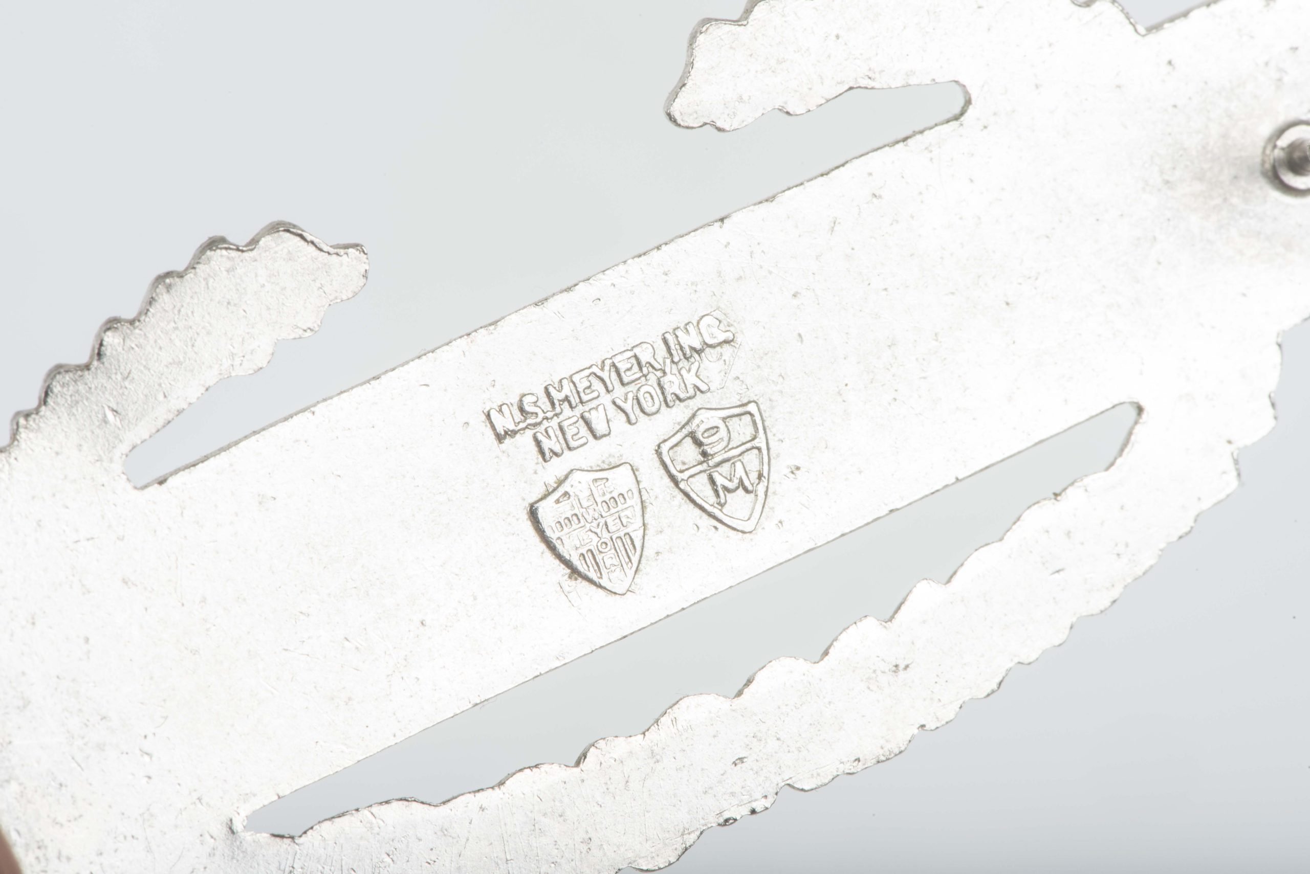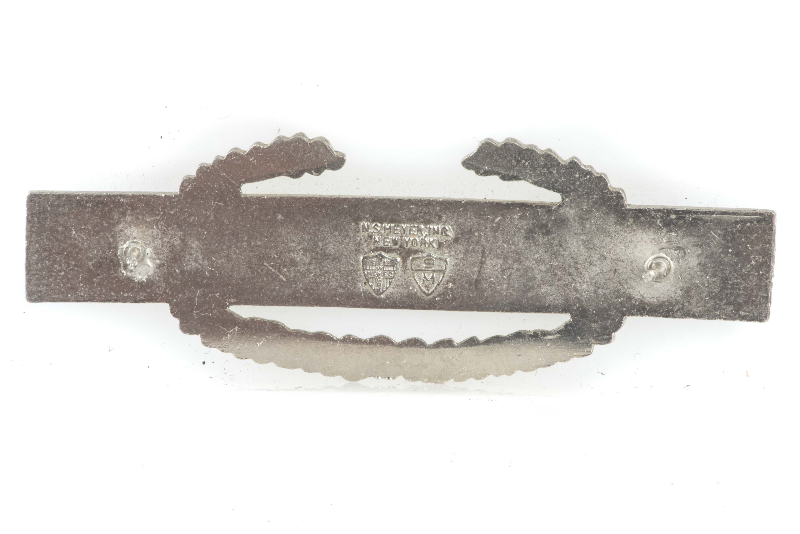 Typical clutchback US Sterling Combat Infantry Badge in good used condition. Sadly the badge is missing the clutches but the pins are intact. The badge is nicely marked Sterling, NS Meyer.