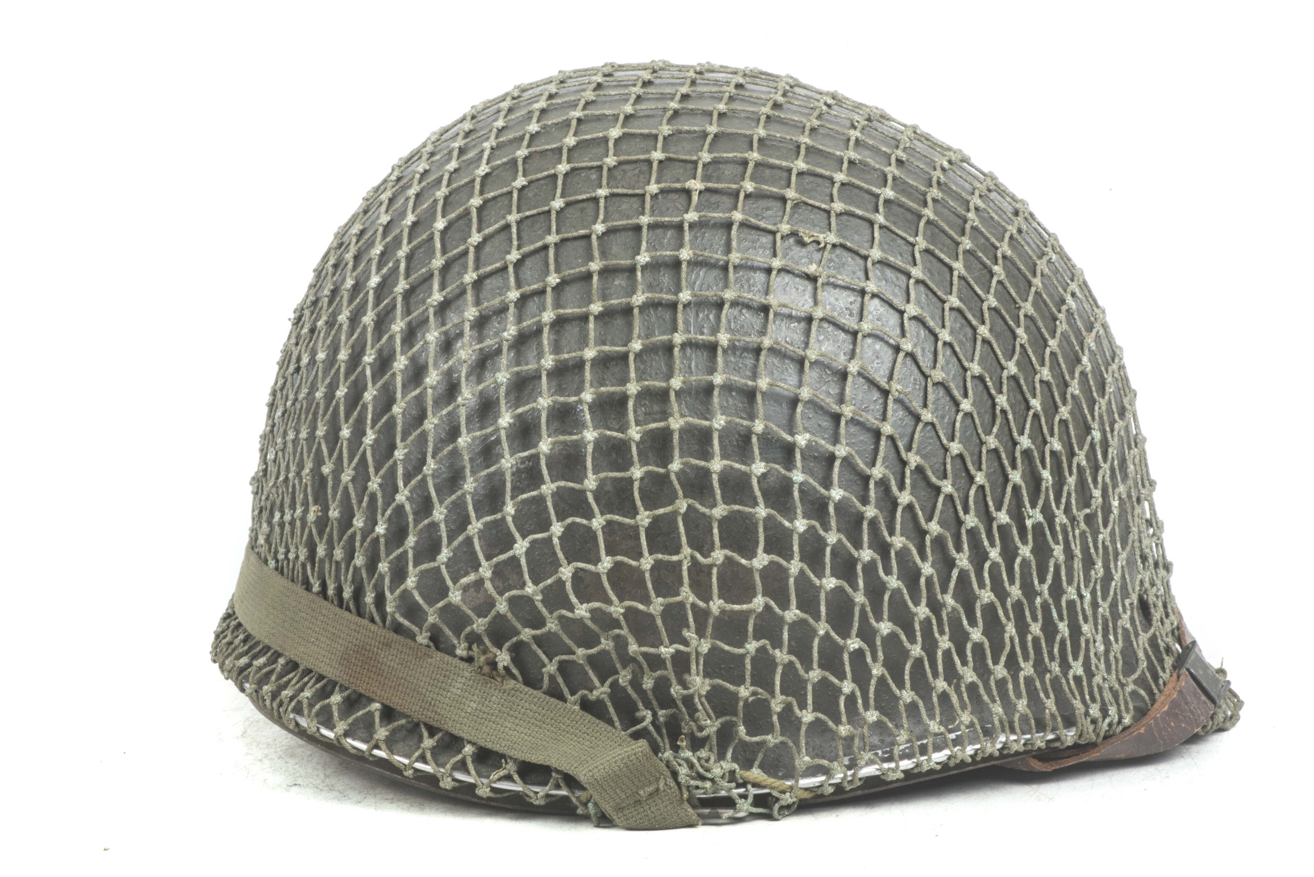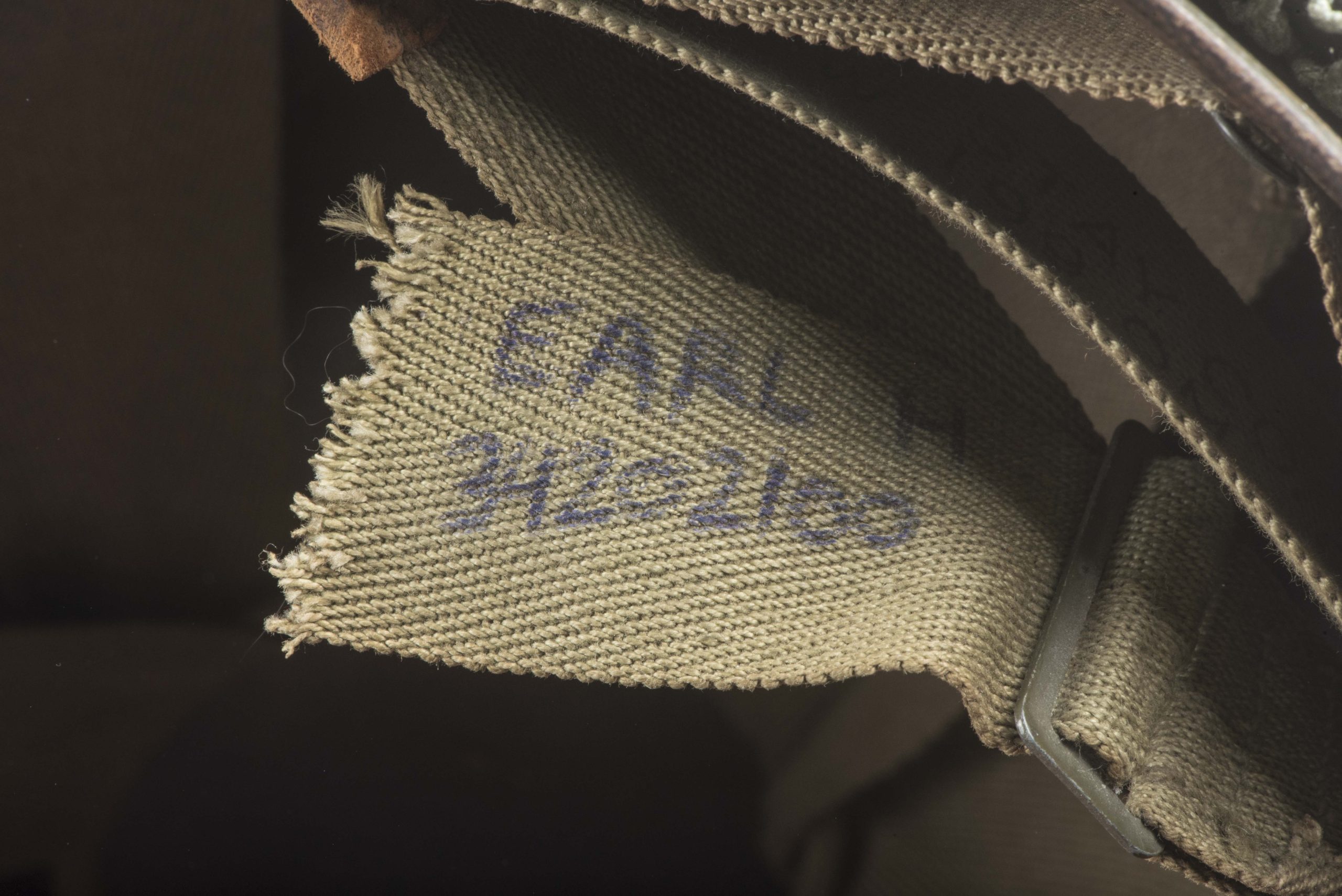 US M1 front seam swivel bale helmet with IMP liner named Mason, Earl H. 34202100. Earl was born in 1911 and enlisted 9 April 1942. According to research Earl Mason was captured by the Germans and imprisoned in Stalag 3A and Oflag 3-6 Luckenwalde, Brandenburg, Prussia. The helmet is in good condition and retains its original liner and both straps. The helmet is a typical late war example. Interestingly other research shows that Earl H Mason was killed in action serving with 31st Infantry Regiment 7th Infantry Division on 12 December 1950 in Korea. He is remembered on the Wall of Rememberance at the UNMCK.