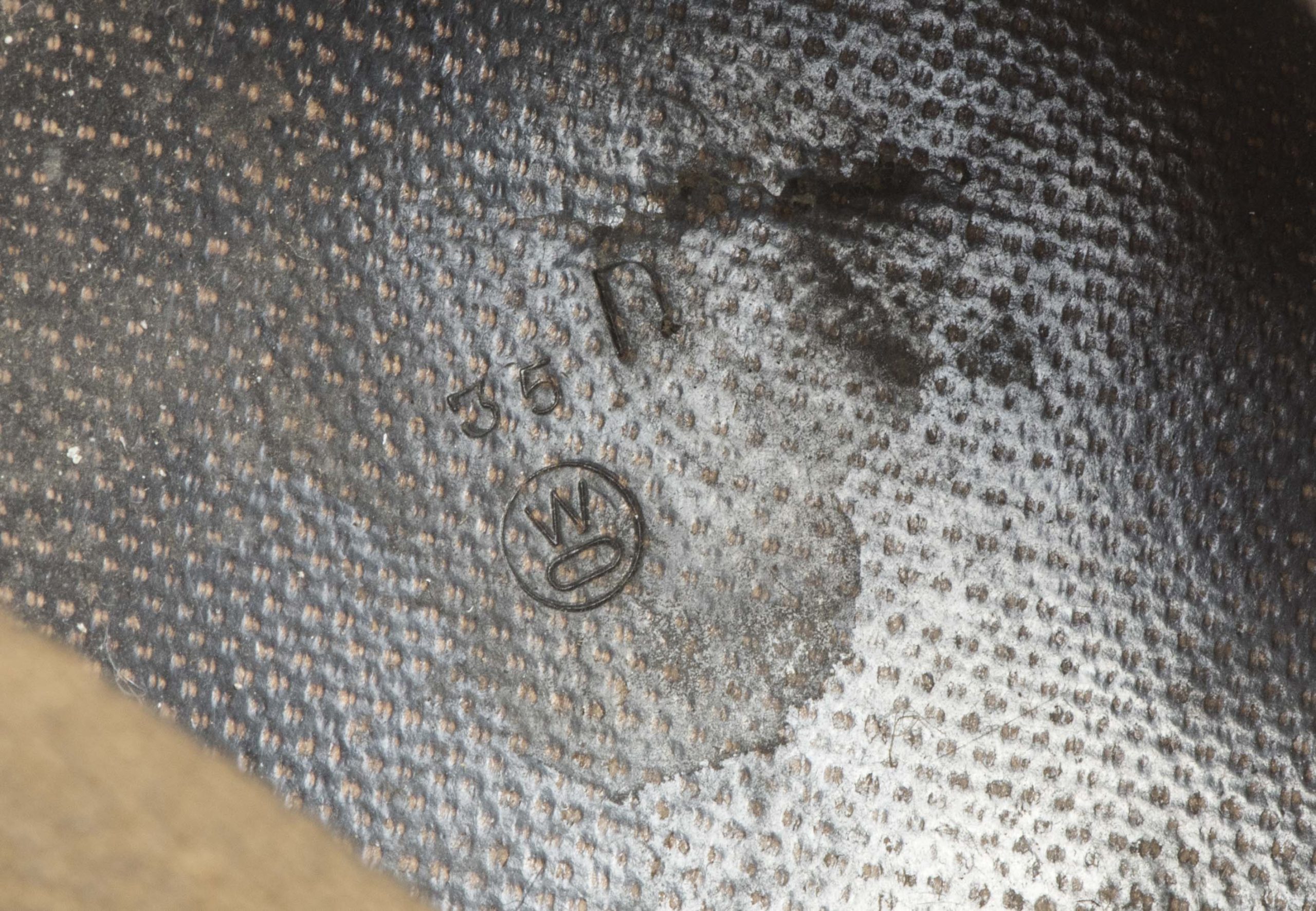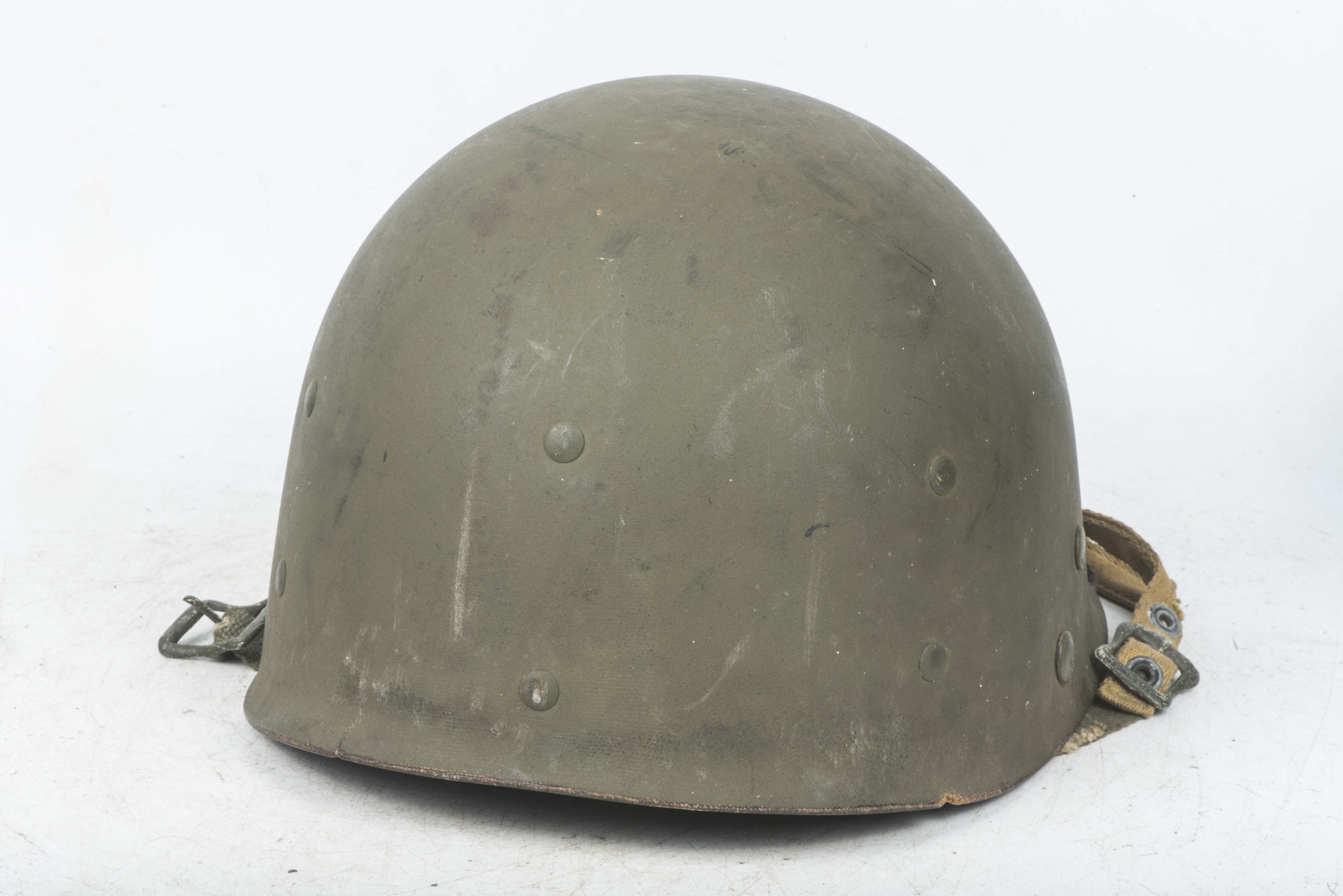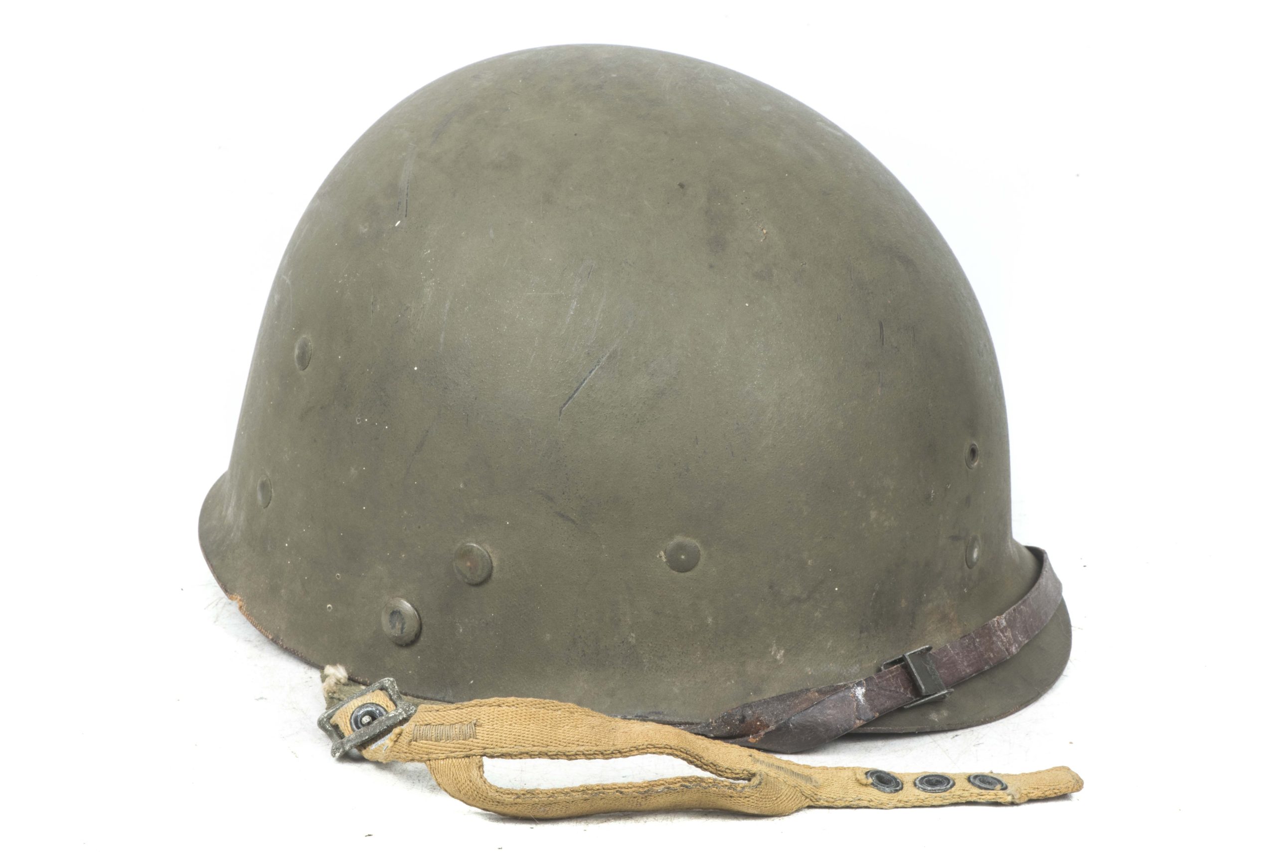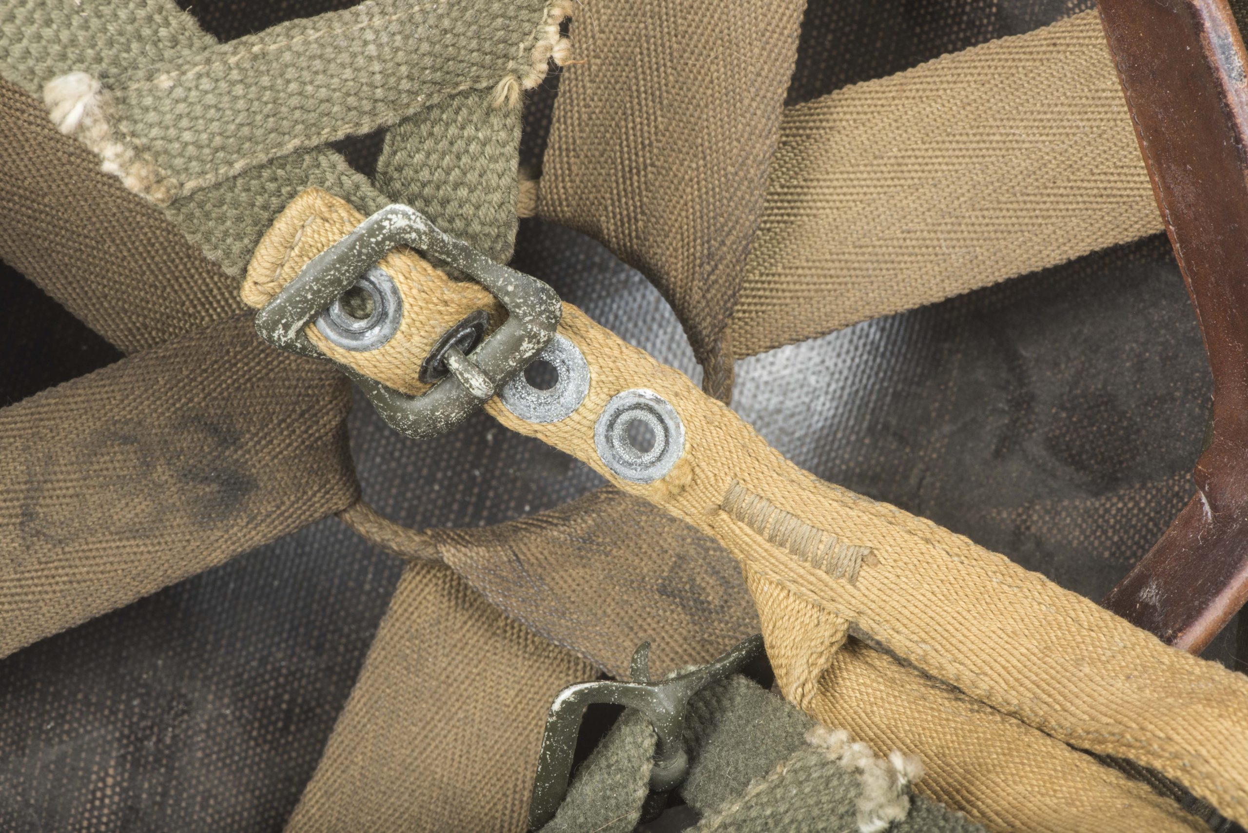 Nice original US M1C Westinghouse paratrooper helmet liner in used condition. The liner retains its leather chinstrap with OD hardware and webbing chincup.