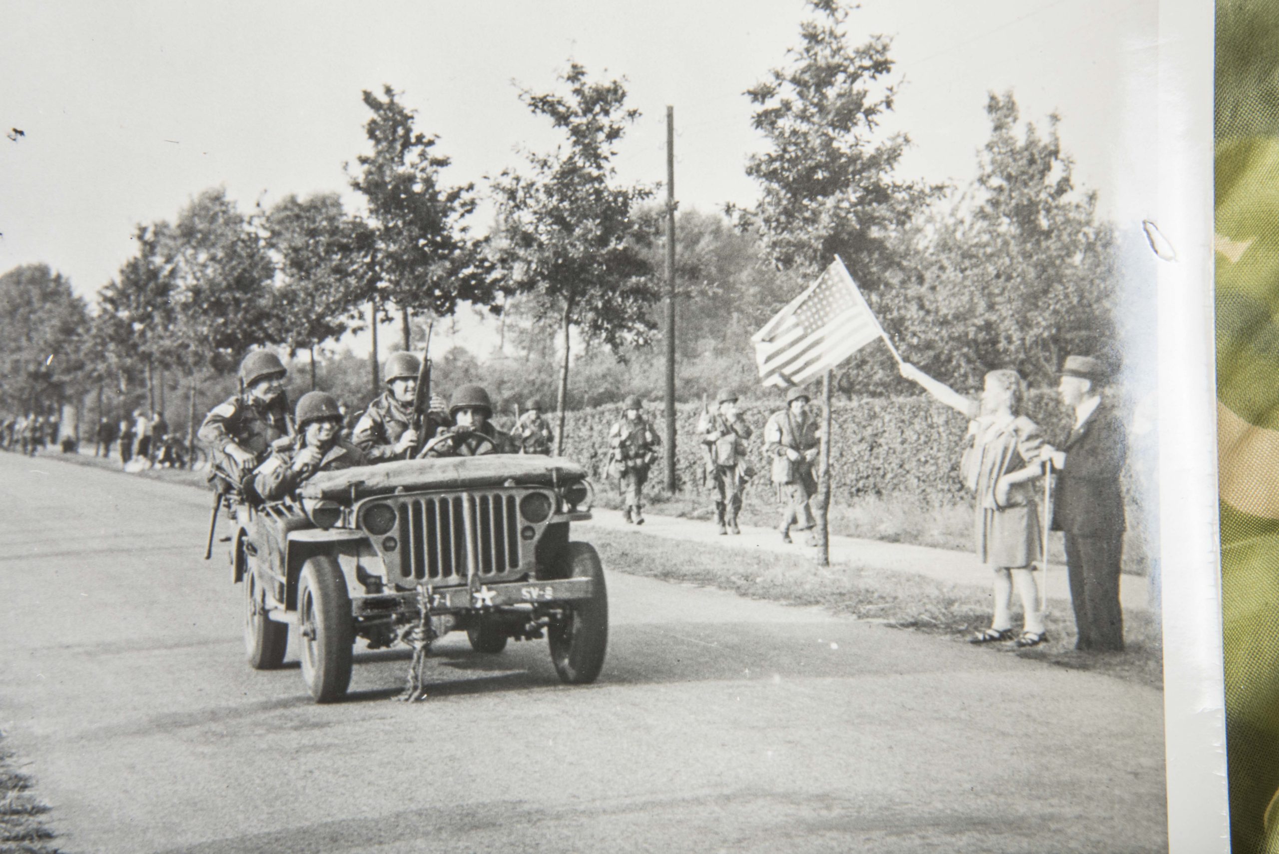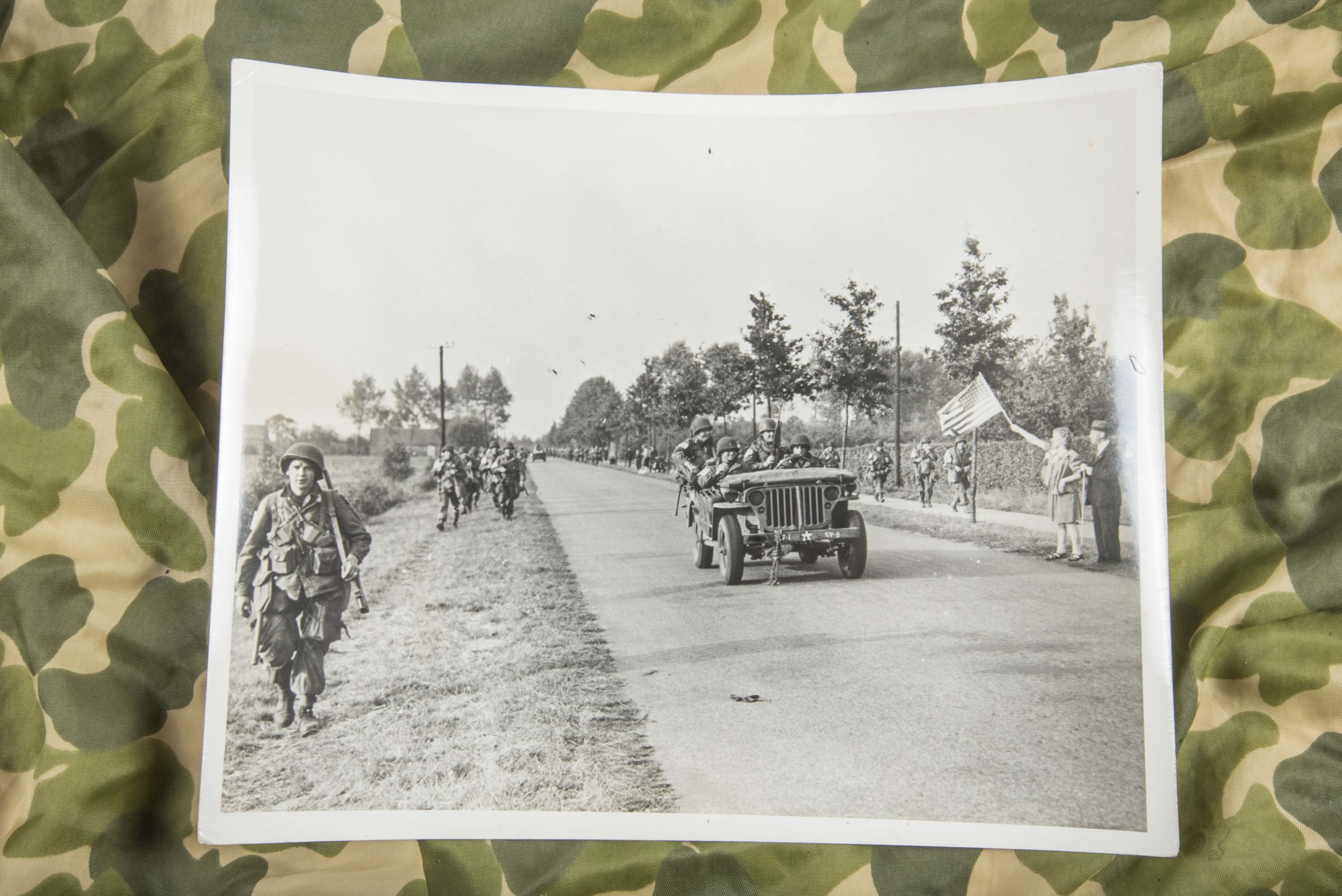 US Photograph: Operation Market Garden 101st Airborne. Great clear photograph of a 101st Airborne Jeep moving towards Son or Veghel. Hard to find, large format photograph.