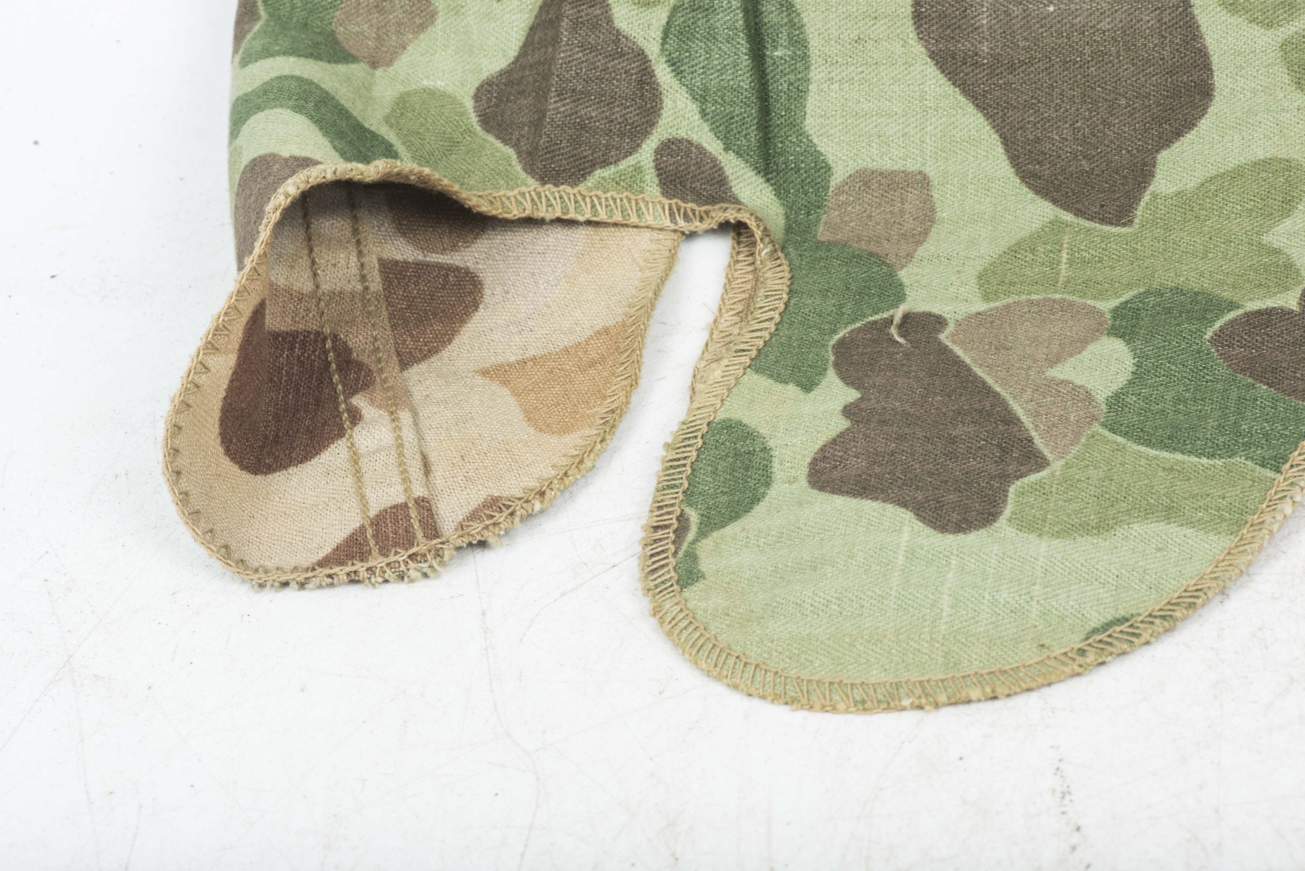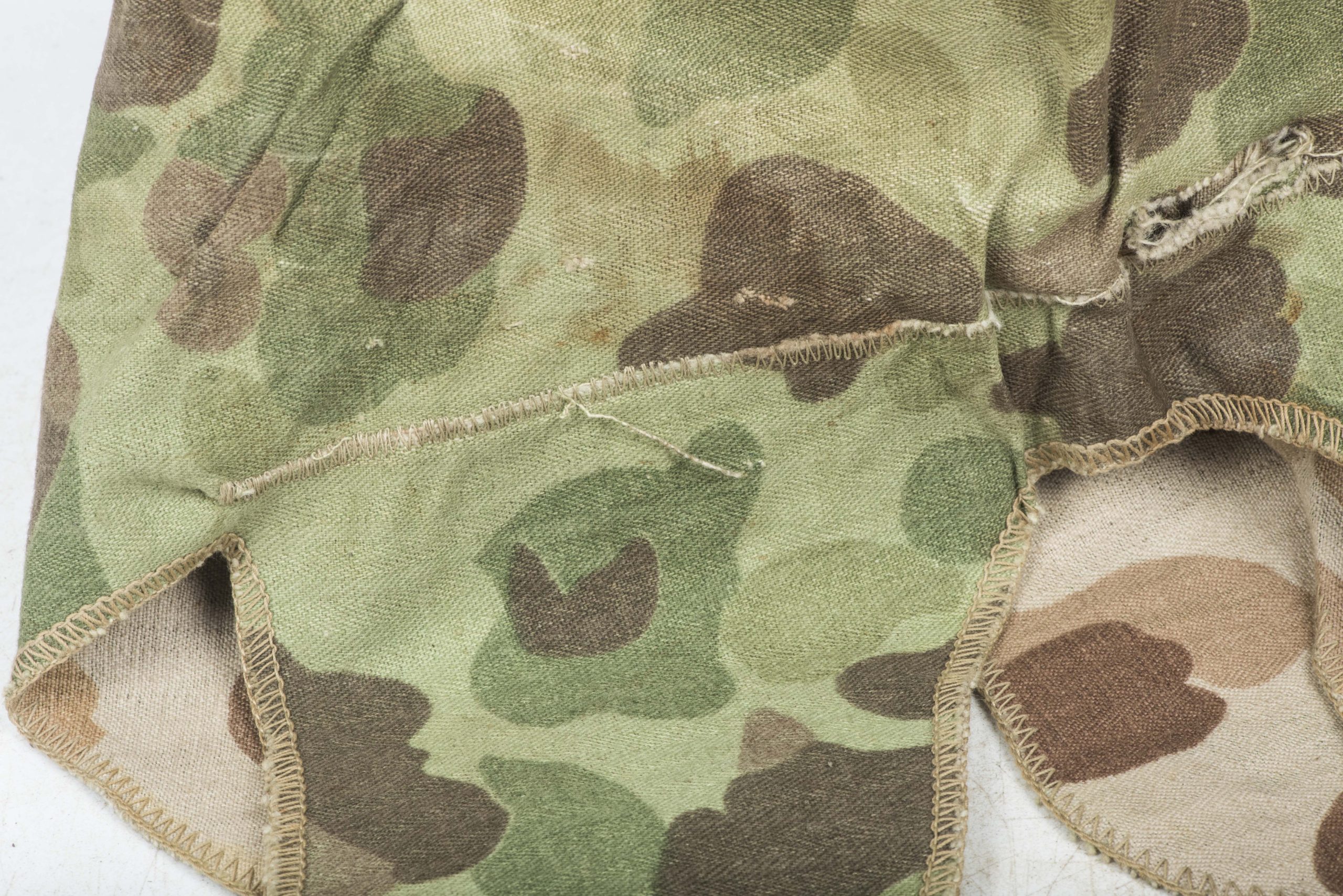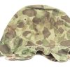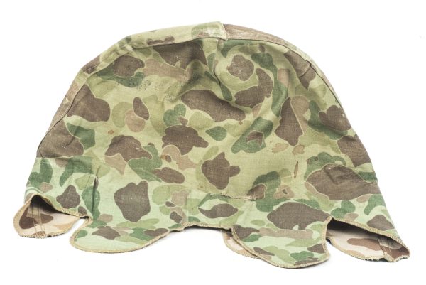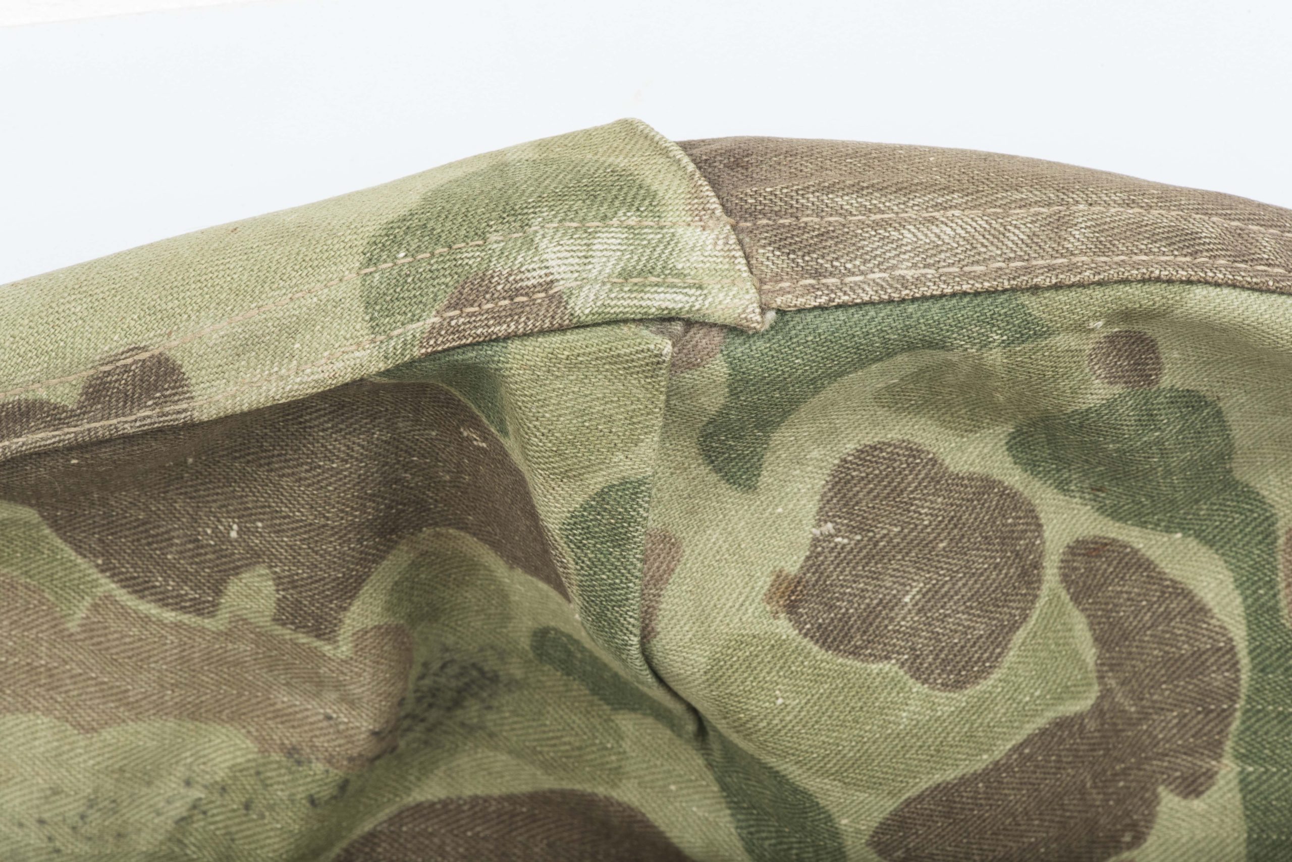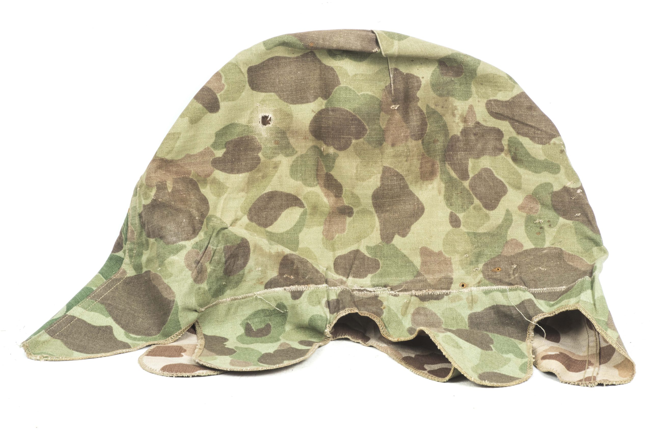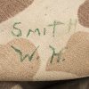 USMC helmet cover named W.H. Smith in excellent used condition. There is a large zigzag sewn repair along the helmets brim. Hard to find example without post war markings!