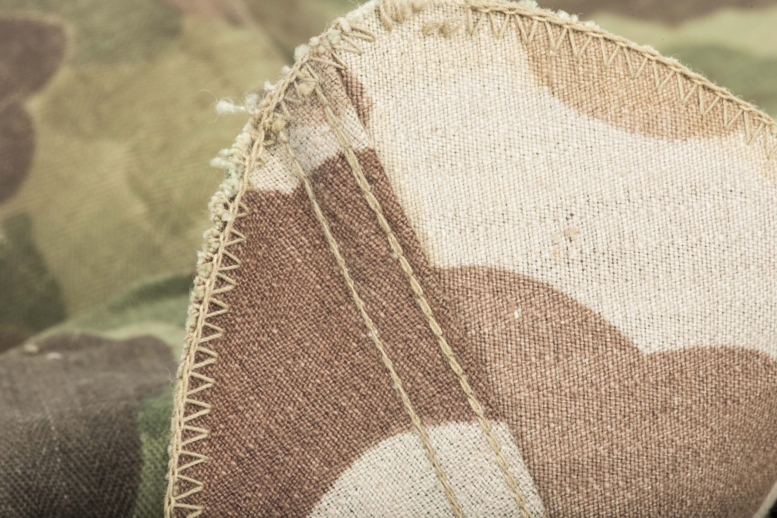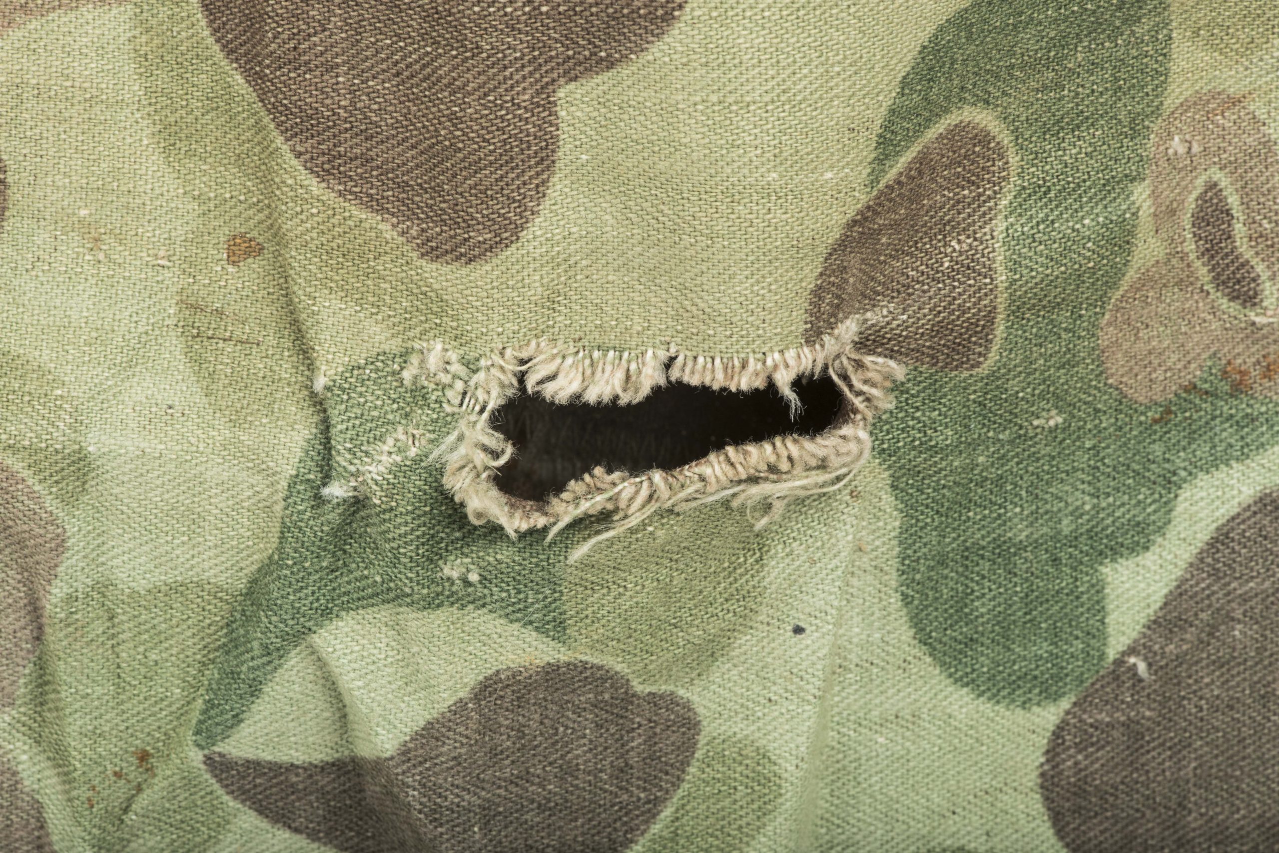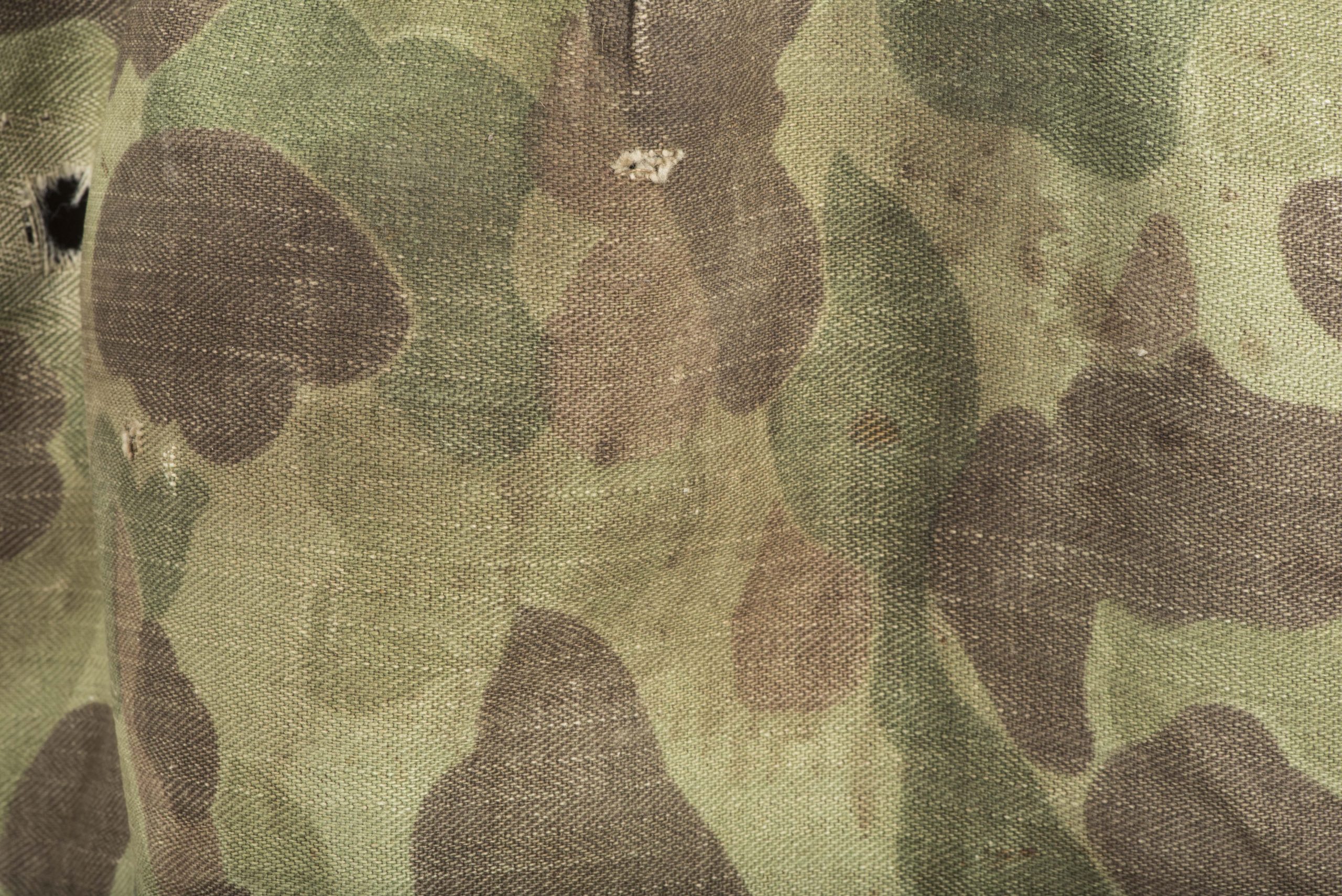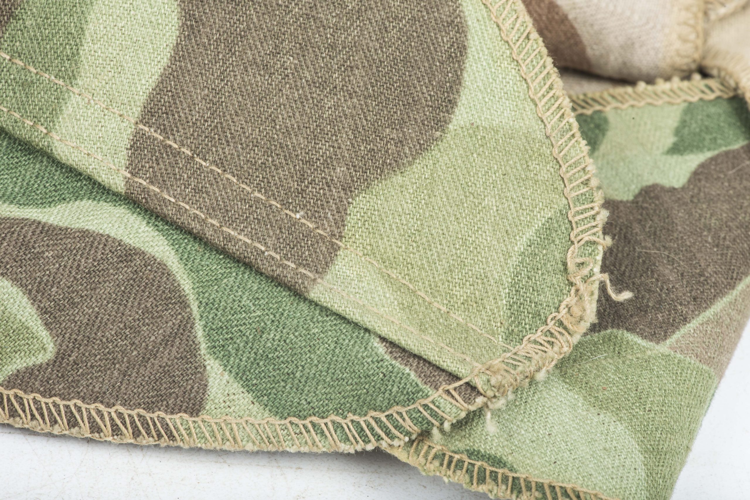 USMC helmet cover named W.H. Smith in excellent used condition. There is a large zigzag sewn repair along the helmets brim. Hard to find example without post war markings!