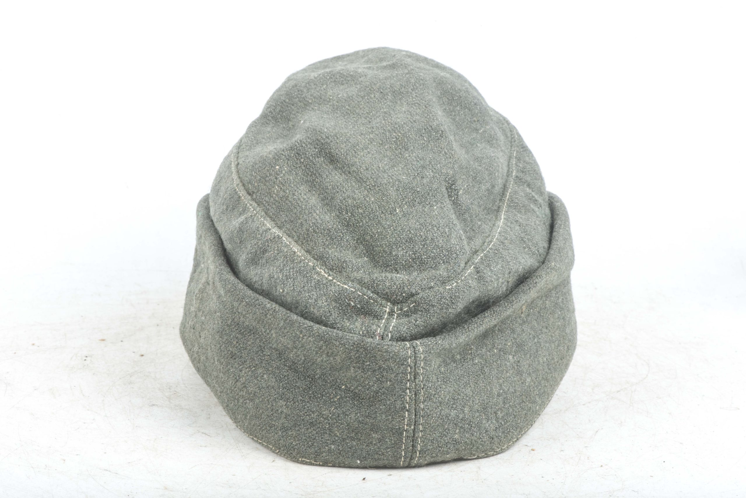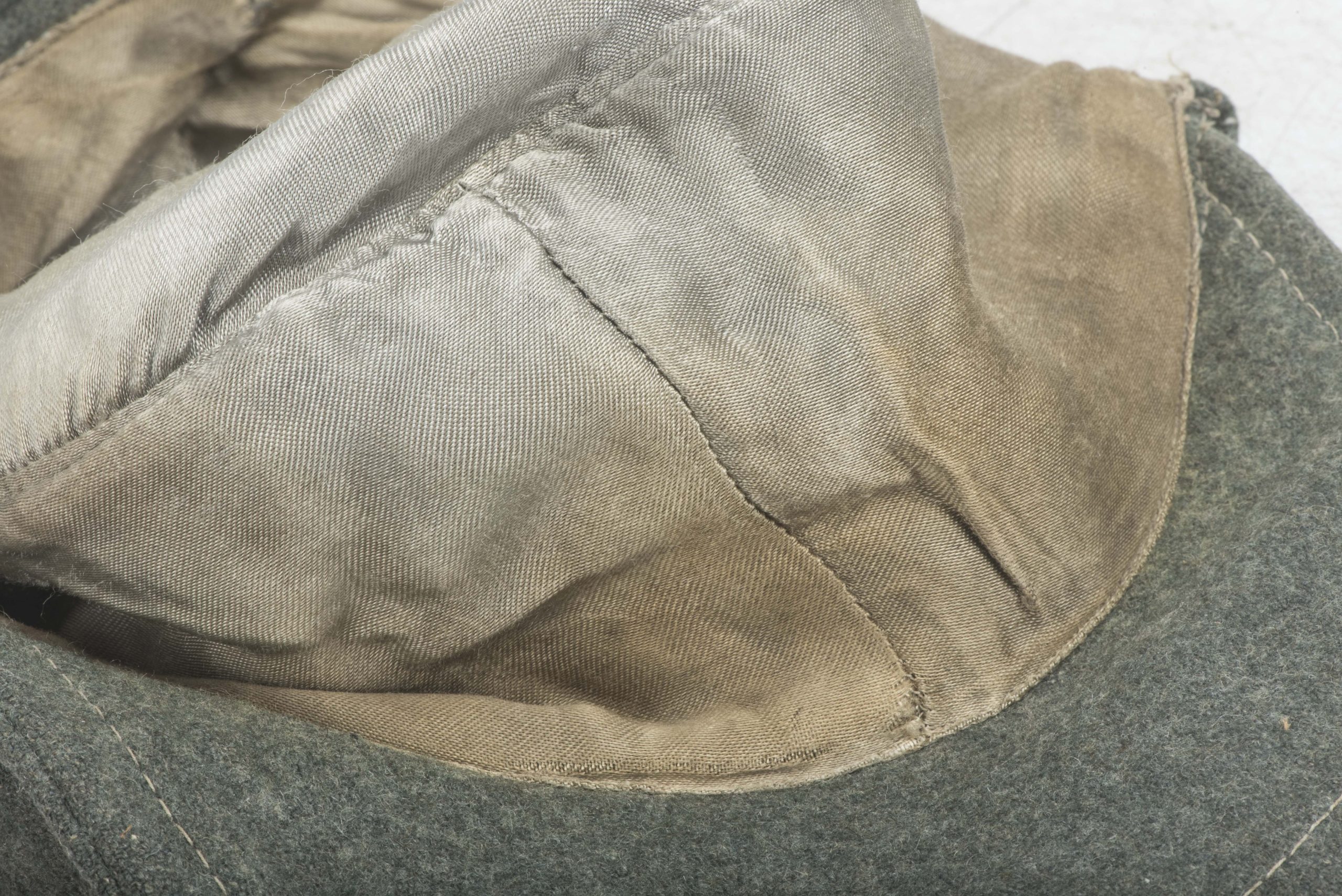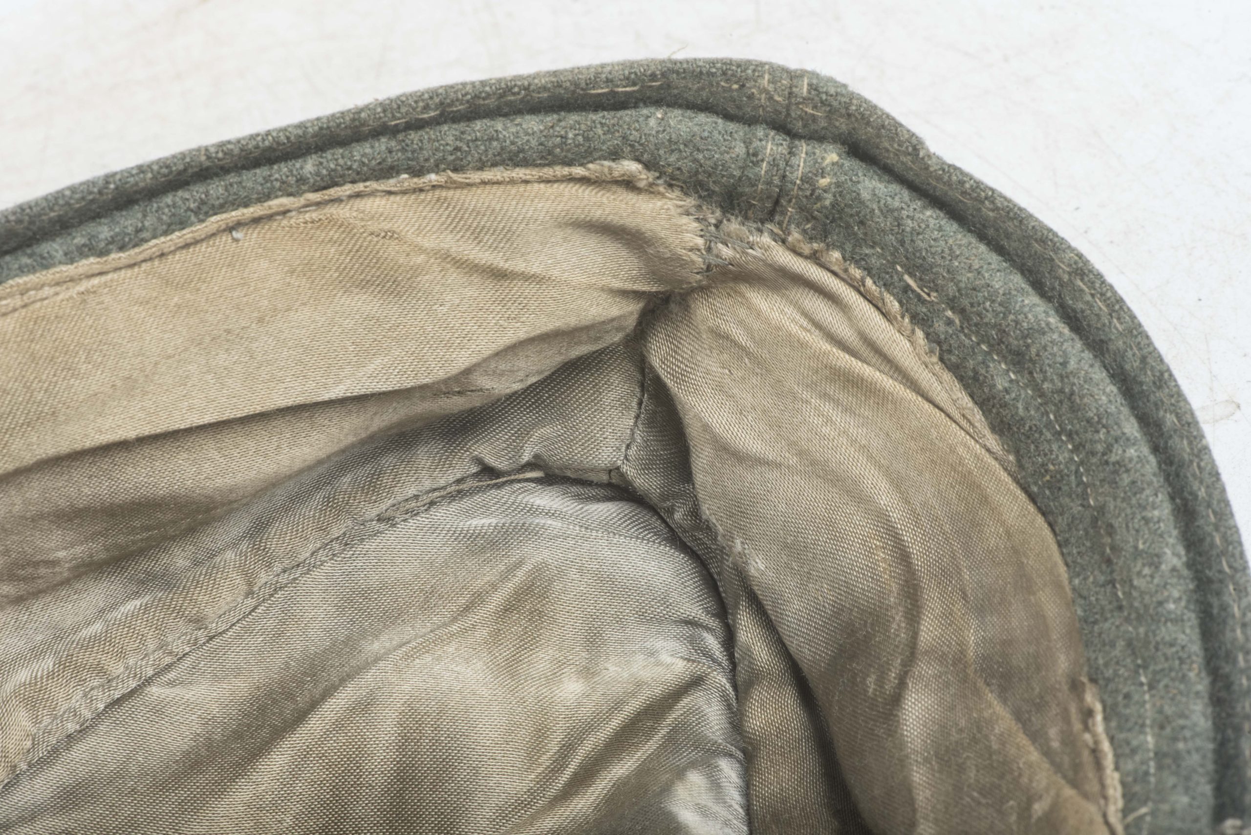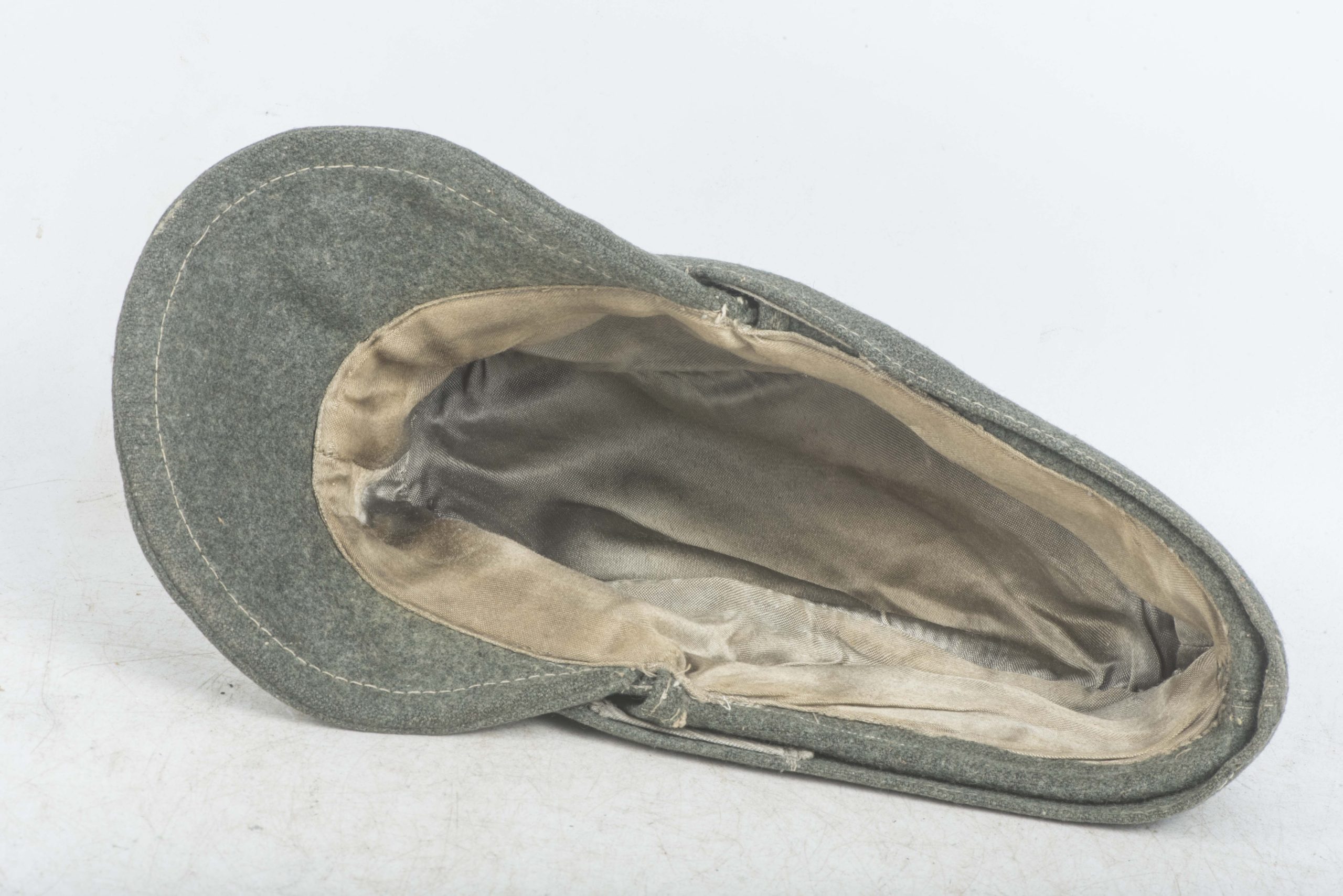 Stripped Waffen-SS / Heer EM/NCO M43 field cap in good condition. The front shows some remnants of the BeVo trapezoid insignia application. This cap could have been issued to the Heer or Waffen-SS. The markings are unreadable. Nice base for restoration or a POW display!