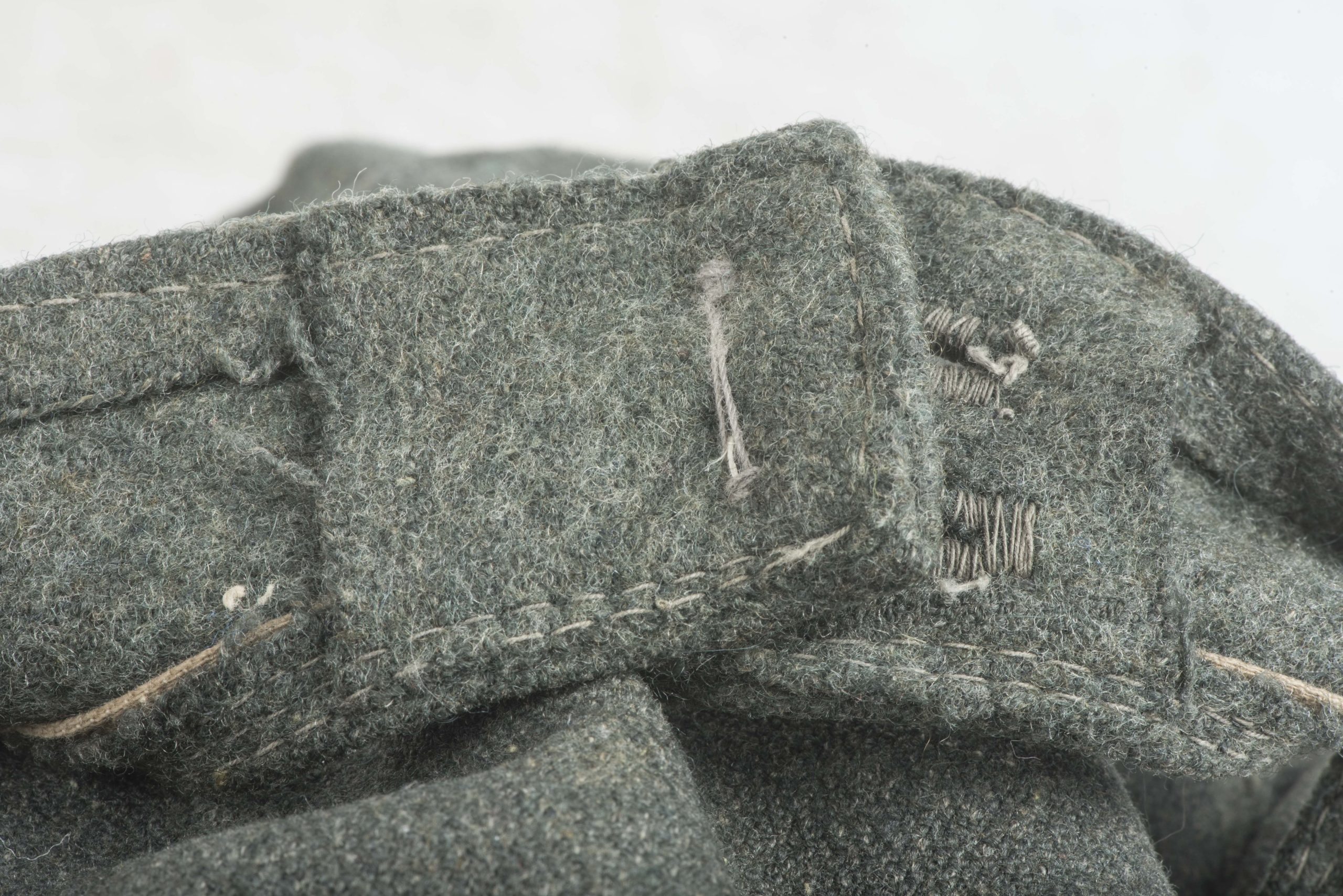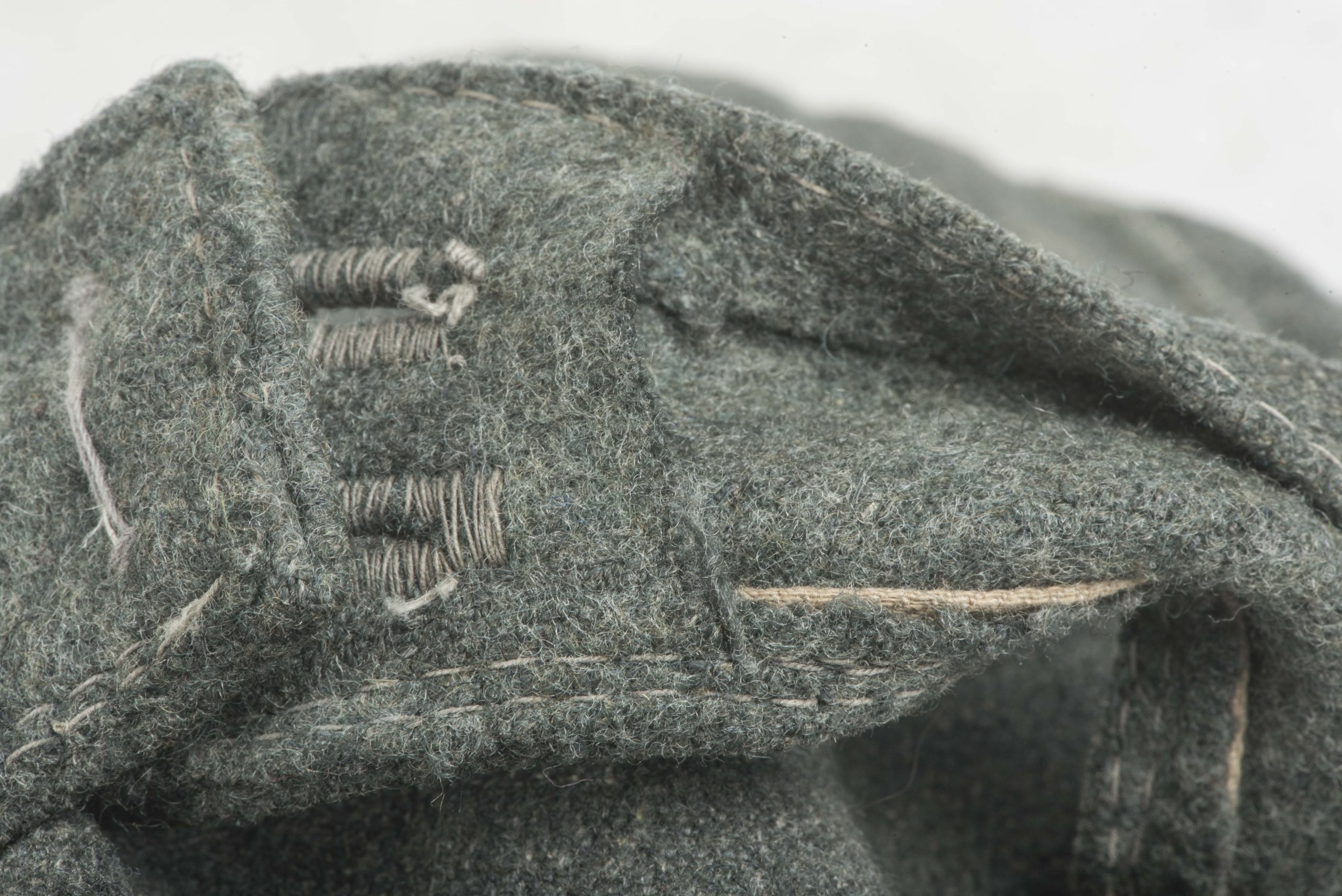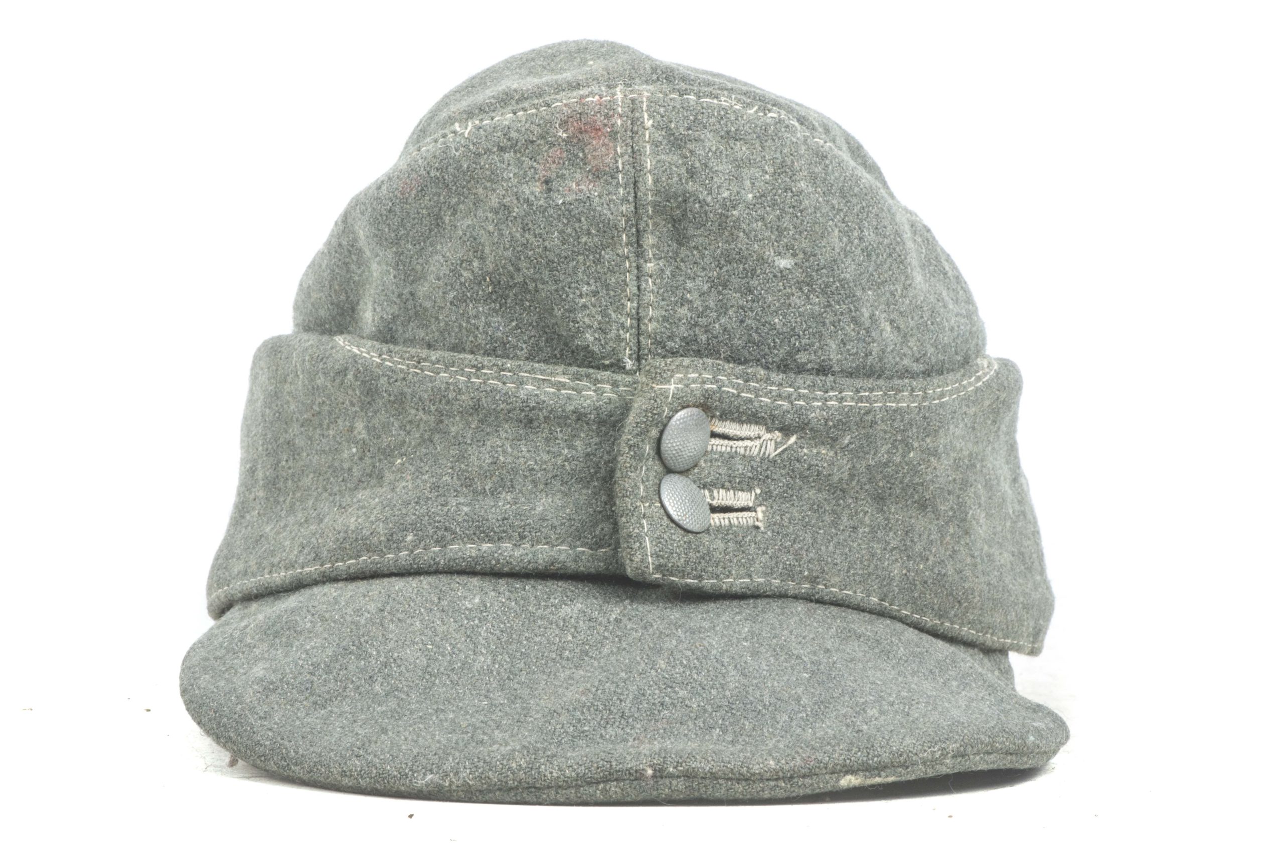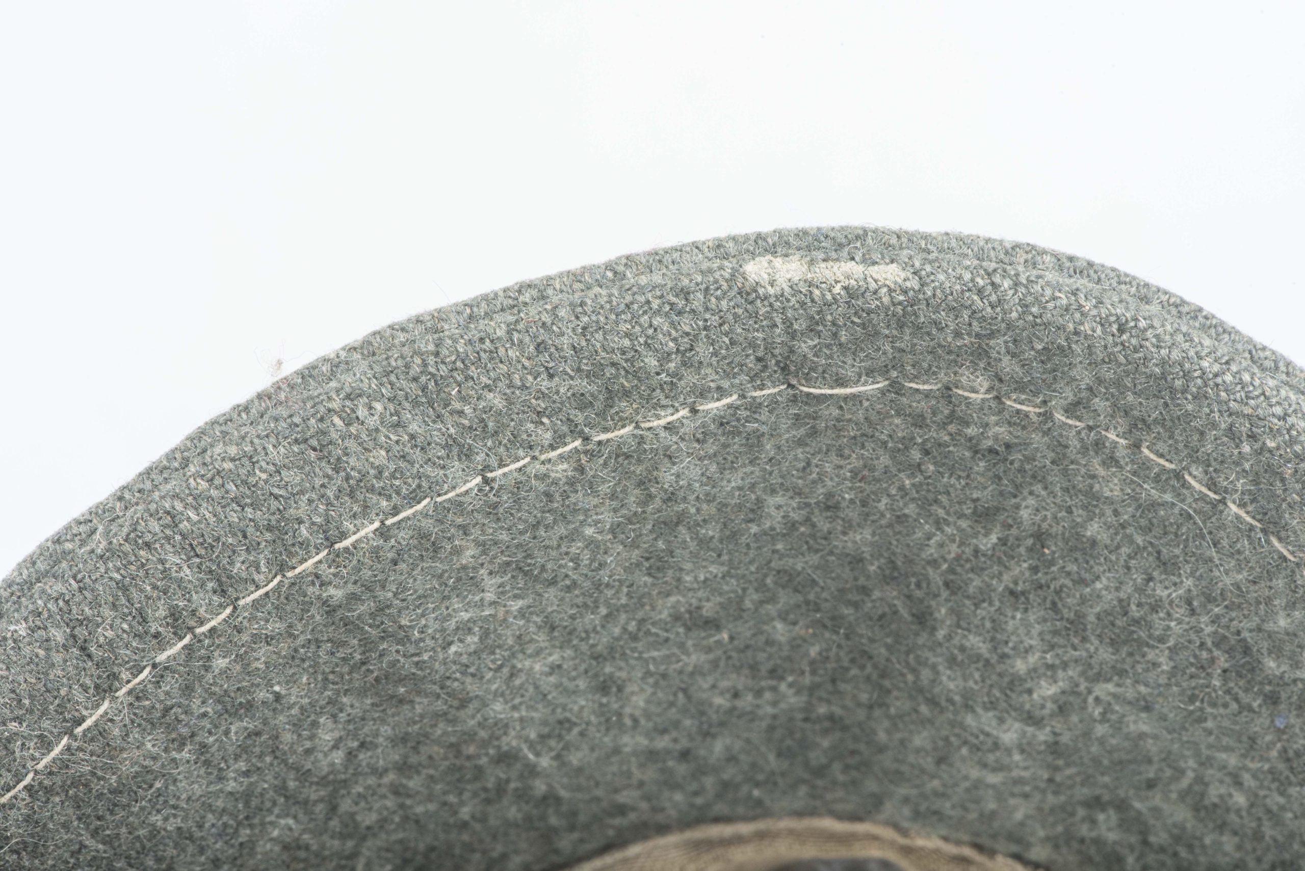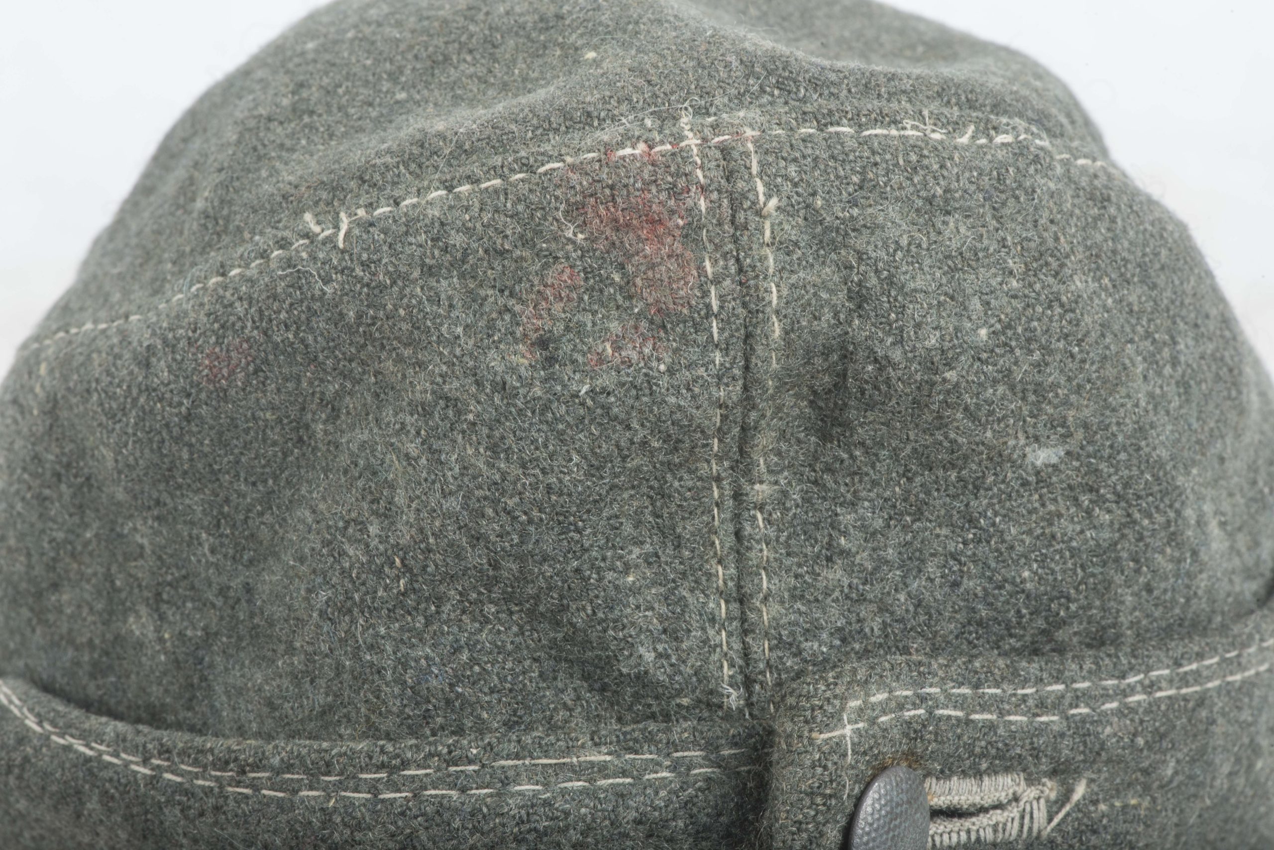 Stripped Waffen-SS / Heer EM/NCO M43 field cap in good condition. The front shows some remnants of the BeVo trapezoid insignia application. This cap could have been issued to the Heer or Waffen-SS. The markings are unreadable. Nice base for restoration or a POW display!