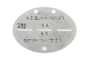Published German ID disc or Erkennungsmarke marked N. Z. III. / Artl. Regt. 215 indicating Nachrichtenzug III Abteilung Artillerie Regiment 215.
