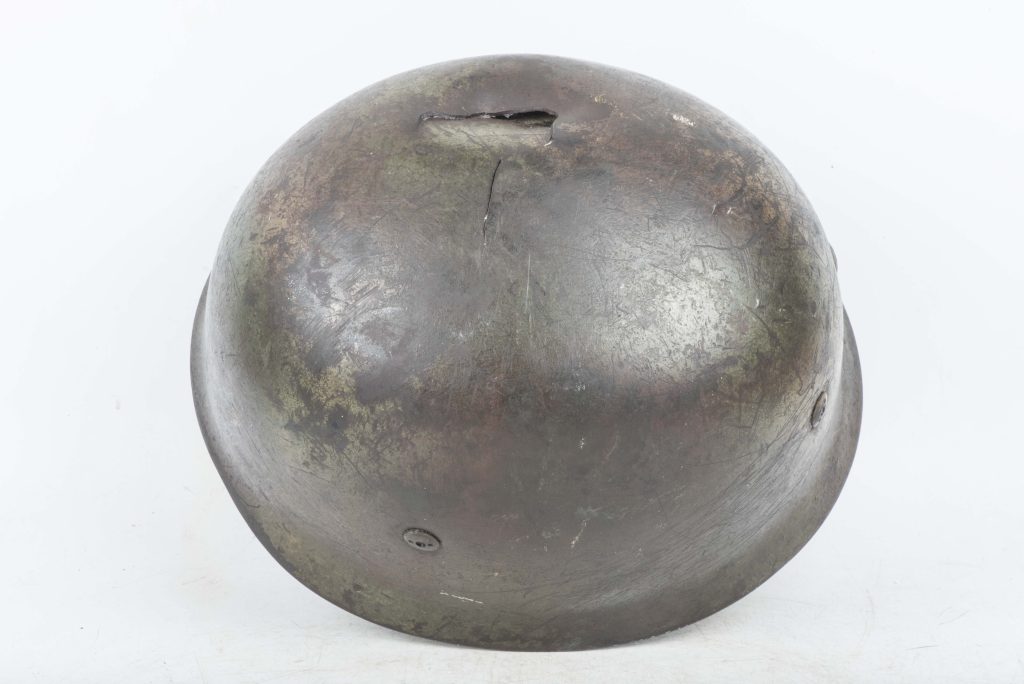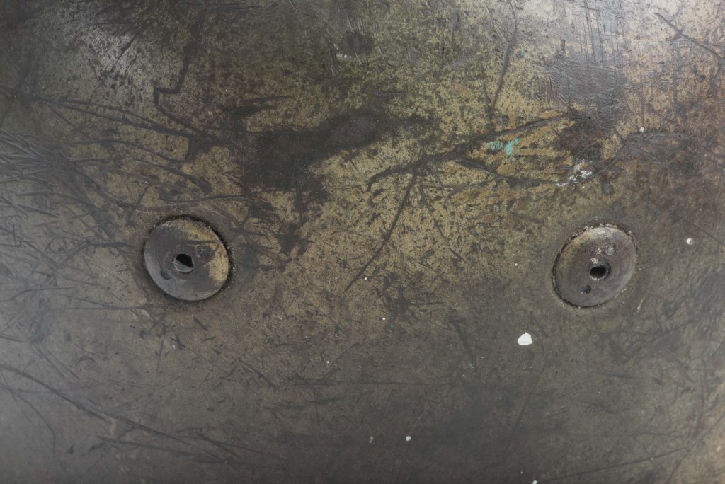 This above helmet was found in the area around Paris together with a Luftwaffe camouflage helmet probably belonging to a Felddivision. The helmet is a textbook late war example with two aluminum and two steel bolts and it looks to have no decal. The helmet is finished in a three-tone camouflage pattern which in my opinion, is very hard to find on a M38 helmet.