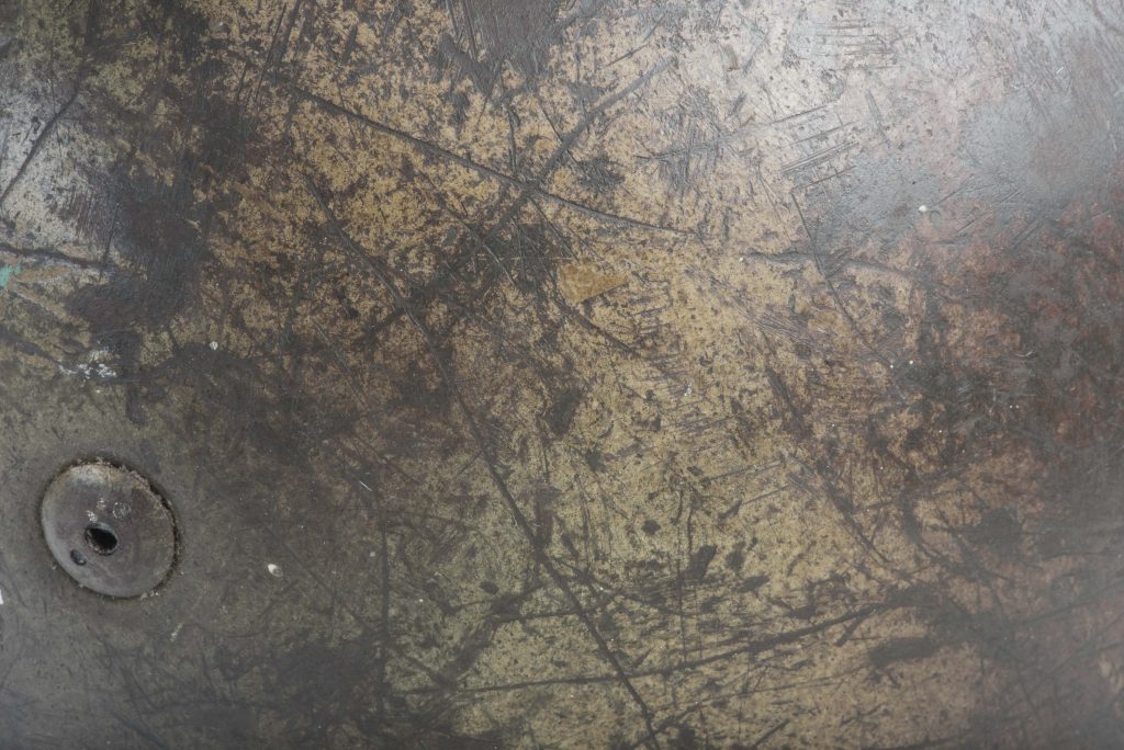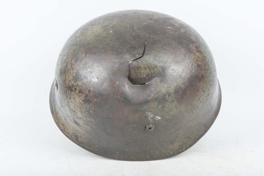 Stellar ET68 M38 paratrooper helmet from Saint–Côme–du-Mont in the typical camouflage pattern. The helmet retains up to 85% of its original finish and its Luftwaffe decal is nicely peaking through the paint. The helmet retains its 4 tight liner bolts with cut chinstraps. The chinstraps and the lack of the liner in combination with the bullet hole in the right flank indicates it was probably removed for being drenched in blood. The helmet also shows the typical oxidation inside for being in contact with blood. The helmet surfaced a good 15 years ago in Normandy when someone visited a Chambre D’hote in Saint–Côme–du-Mont and was gifted this helmet along with a US tanker helmet. This village was the theatre of a heavy battle between Fallschirmjäger Regiment 6 and the US 506 PIR on June 7-8 1944. The helmet has a clear bullet hole on the right flank most probably killing the wearer. Unfortunately, the helmet shell is not named. The helmet is marked ET68 indicating production by Eisenhuttenwerke Thale.